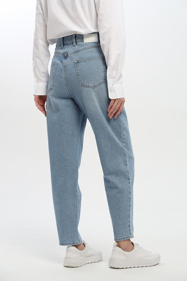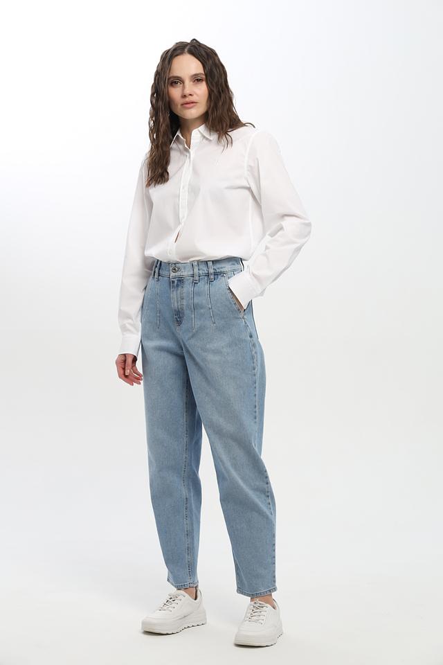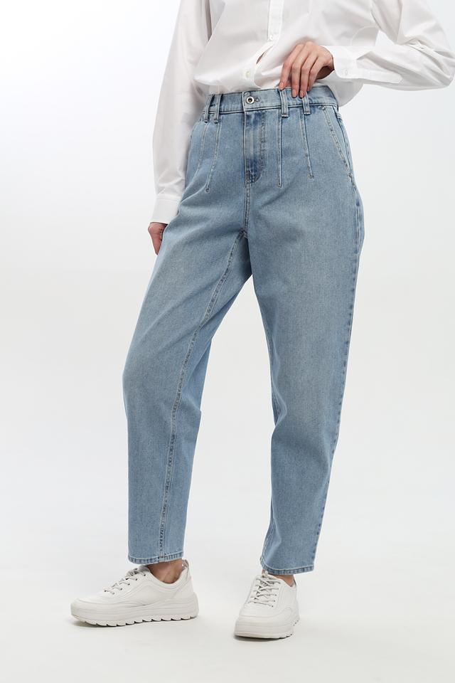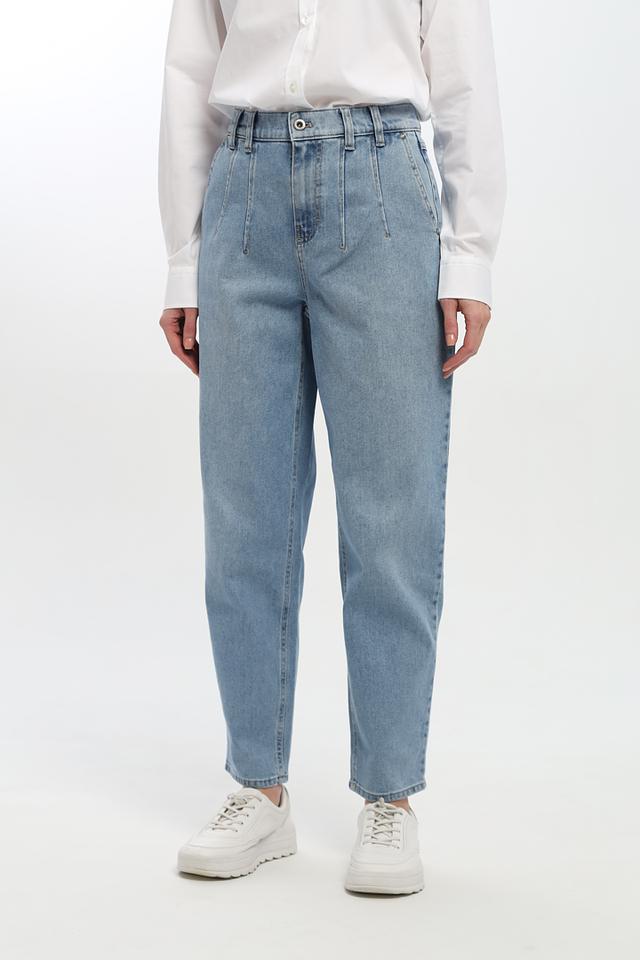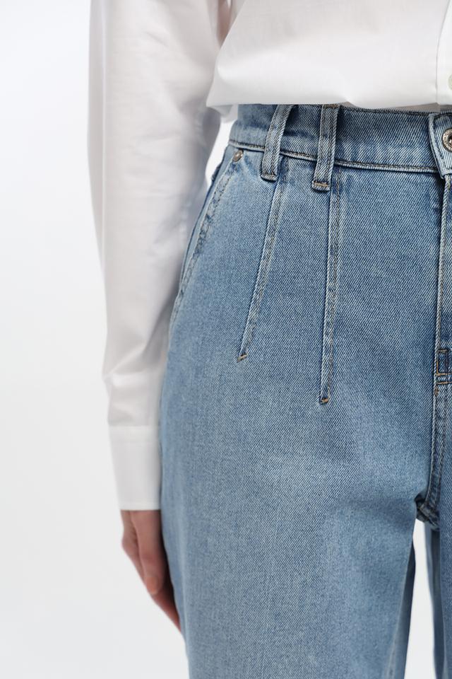 Джинсы имеют завышенную талию и широкие штанины, что создает современный и расслабленный силуэт. На передней части брюк расположены аккуратные складки, добавляющие изысканности образу. Пять карманов — два спереди, два сзади и один небольшой карман для мелочи — обеспечивают функциональность.