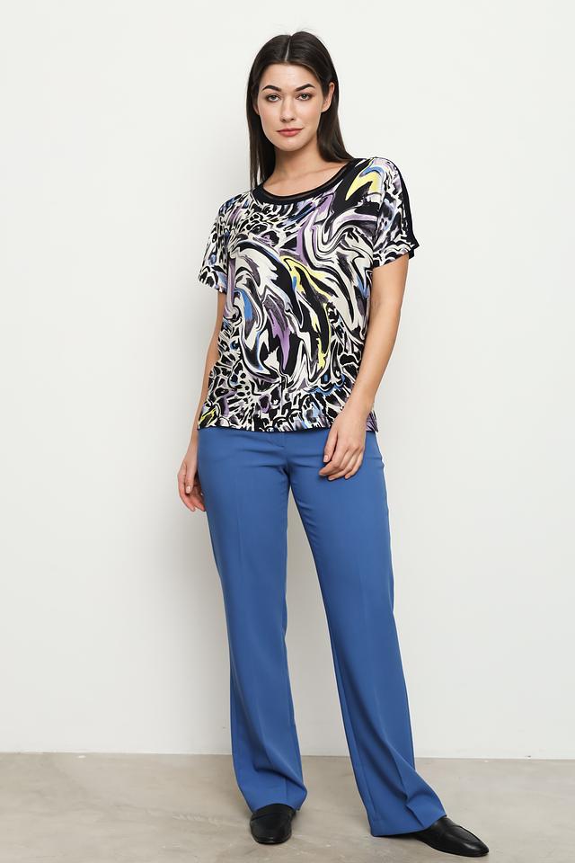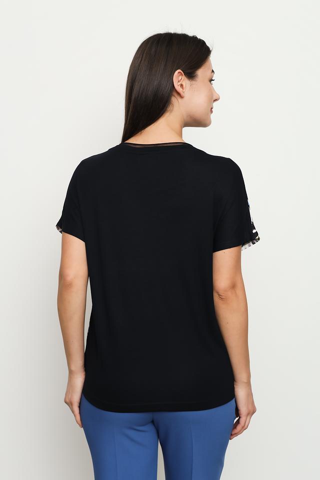Круглый вырез горловины и короткие рукава обеспечивают свободу движений. Черная отделка горловины и рукавов добавляет контраста и завершенности образу. Футболка идеально сочетается с джинсами, брюками или юбками, позволяя создавать разнообразные стильные комплекты.