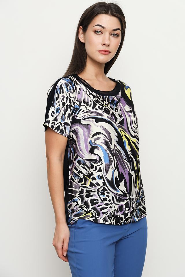 Особенностью данной модели является яркий и необычный абстрактный принт, выполненный в сочетании черного, фиолетового, желтого и белого цветов. Принт создает эффектные "мраморные" разводы, делая футболку уникальной и запоминающейся.
