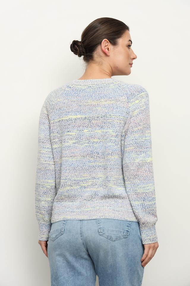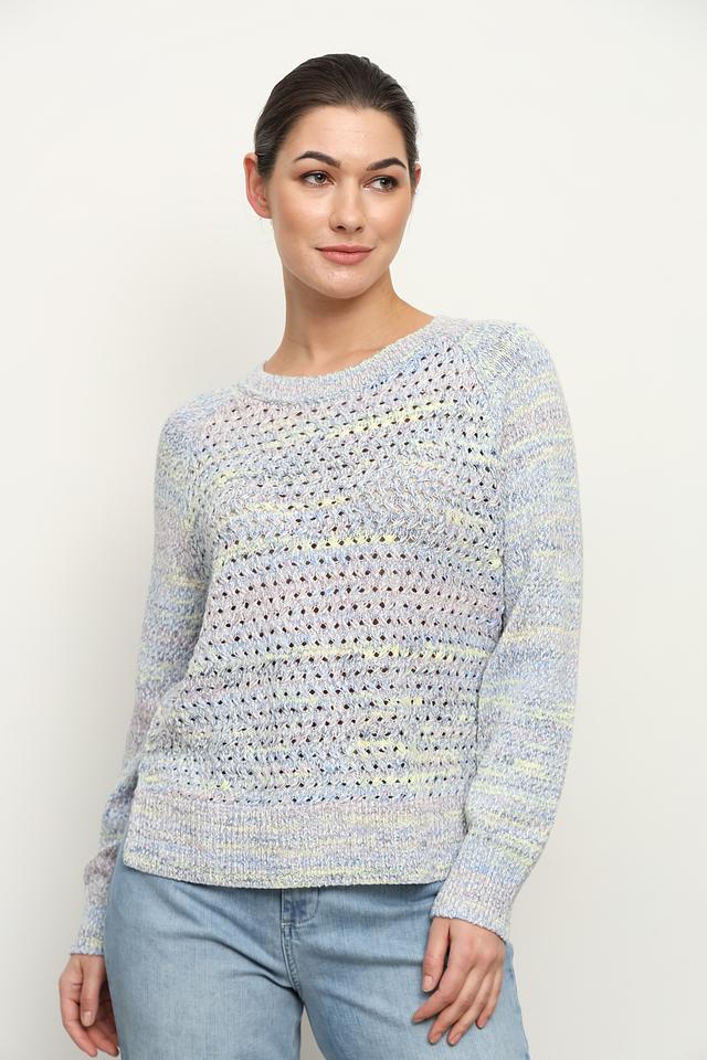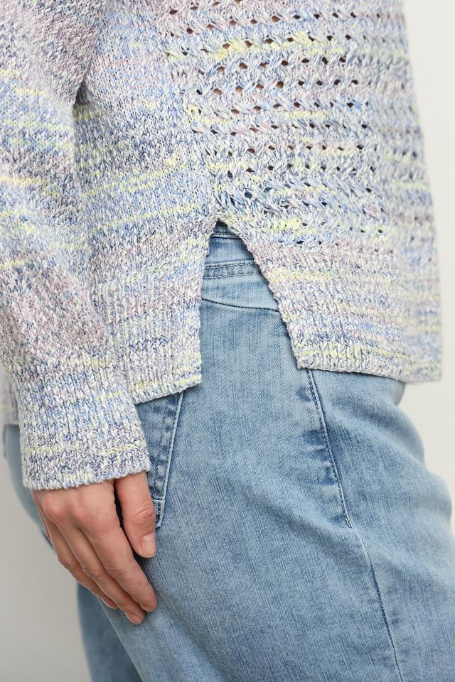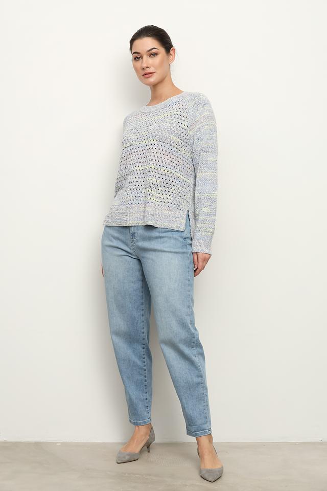 Цветовая гамма пуловера представляет собой сочетание голубого, жёлтого и белого оттенков, создавая нежный и романтичный образ. Такой пуловер легко сочетается с джинсами, брюками или юбками, позволяя создавать разнообразные стильные комплекты. Он станет незаменимой вещью в вашем гардеробе, добавляя нотку женственности и элегантности.
