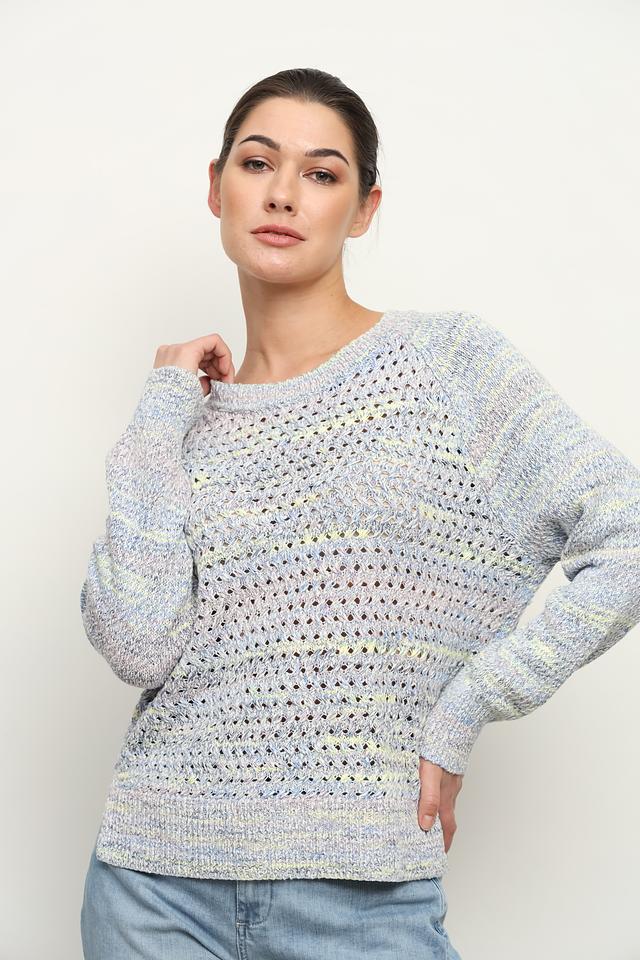 Пуловер имеет свободный крой, который не сковывает движений и обеспечивает удобную посадку по фигуре. Округлый вырез горловины и длинные рукава делают его универсальным для различных образов. Ажурная вязка придает изделию легкость и воздушность, делая его идеальным выбором для теплой погоды.