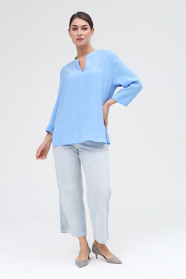 Блуза имеет V-образный вырез, который визуально удлиняет шею и придает образу женственность. Рукава длиной 3/4 делают ее универсальной для любого времени года.