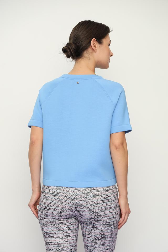 Пуловер имеет прямой крой, короткий рукав и круглый вырез горловины. На передней части расположен накладной карман, который добавляет модели оригинальности. Голубой цвет пуловера освежает образ и легко сочетается с другими элементами одежды.