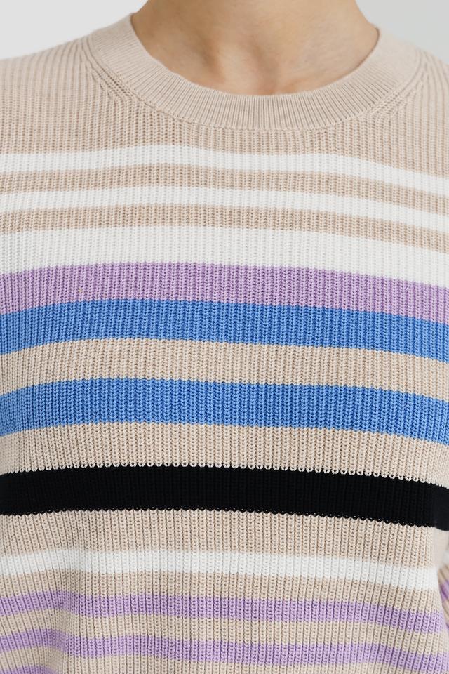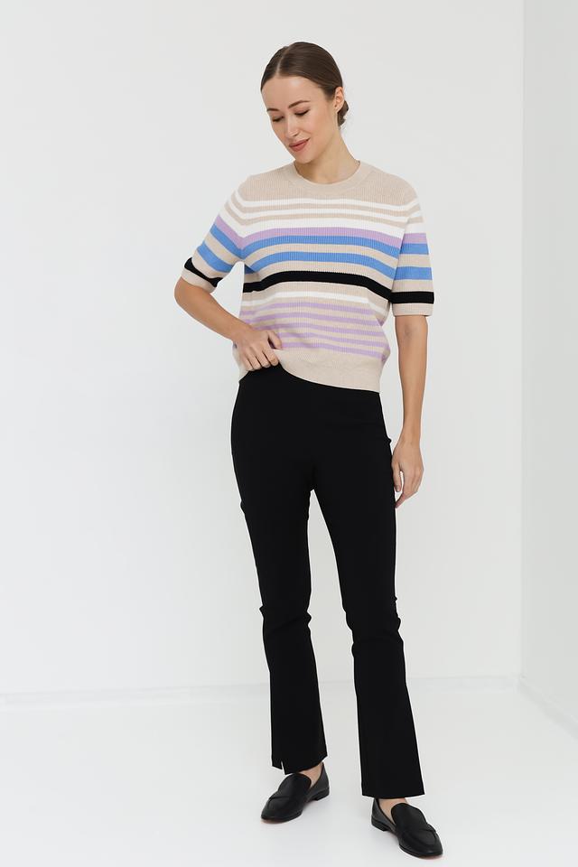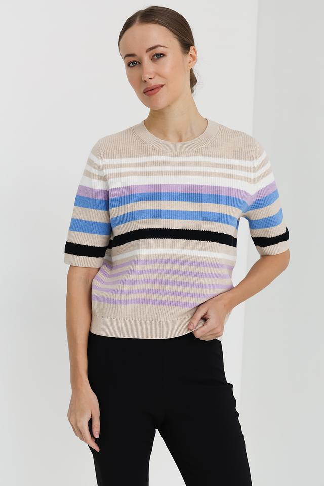 Пуловер имеет классический крой с круглым вырезом горловины и короткими рукавами, что делает его идеальным для теплой погоды или для создания многослойных образов. Яркая полосатая отделка добавляет образу динамичности и оригинальности.