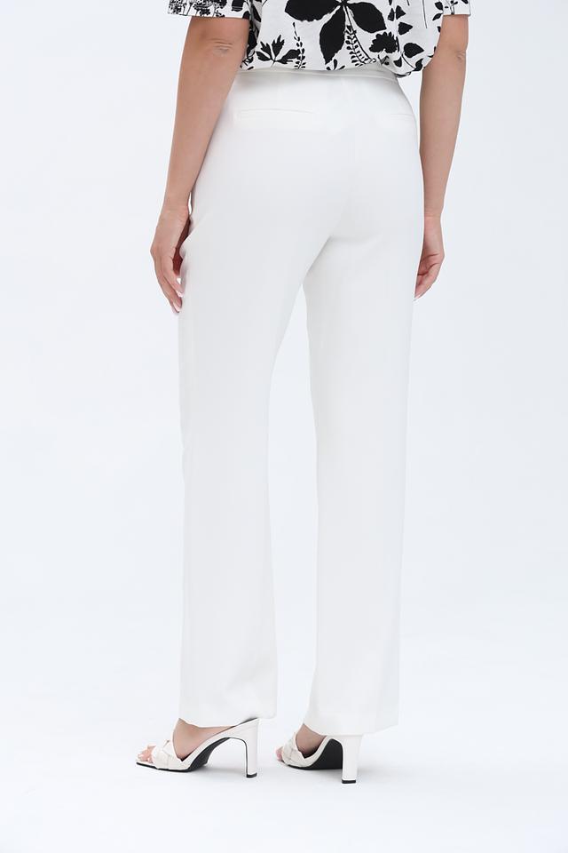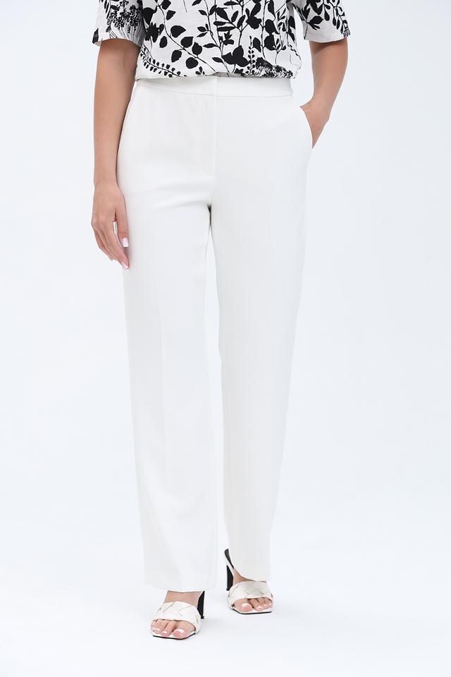 Брюки имеют стандартную посадку на талии и застегиваются на молнию и пуговицу. Прямой крой визуально удлиняет ноги и делает силуэт более стройным.