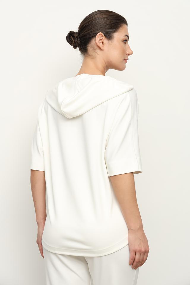 Модель имеет прямой крой, короткий рукав и удобный капюшон с кулисками. Простой и лаконичный дизайн делает эту толстовку универсальной – она легко сочетается с различными элементами одежды, от джинсов до юбок.