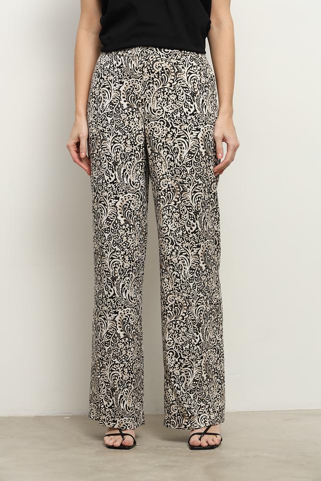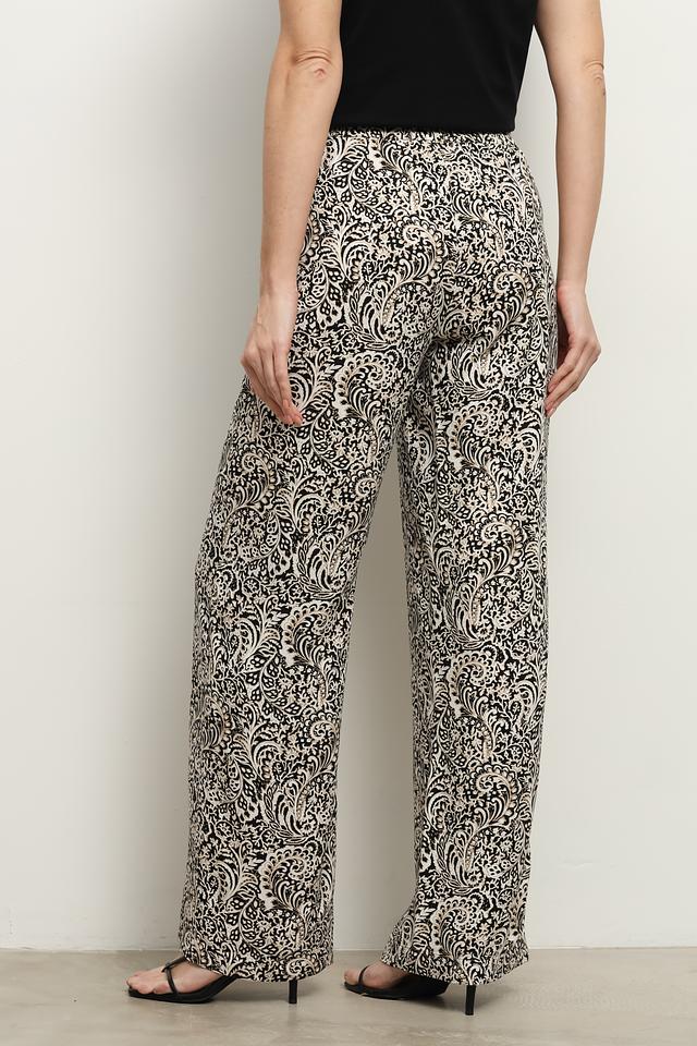 Особенностью модели является яркий цветочный принт в бежевых и чёрных тонах, который придаёт образу женственность и изысканность. Прямой крой и эластичный пояс обеспечивают свободу движений и идеальную посадку по фигуре.