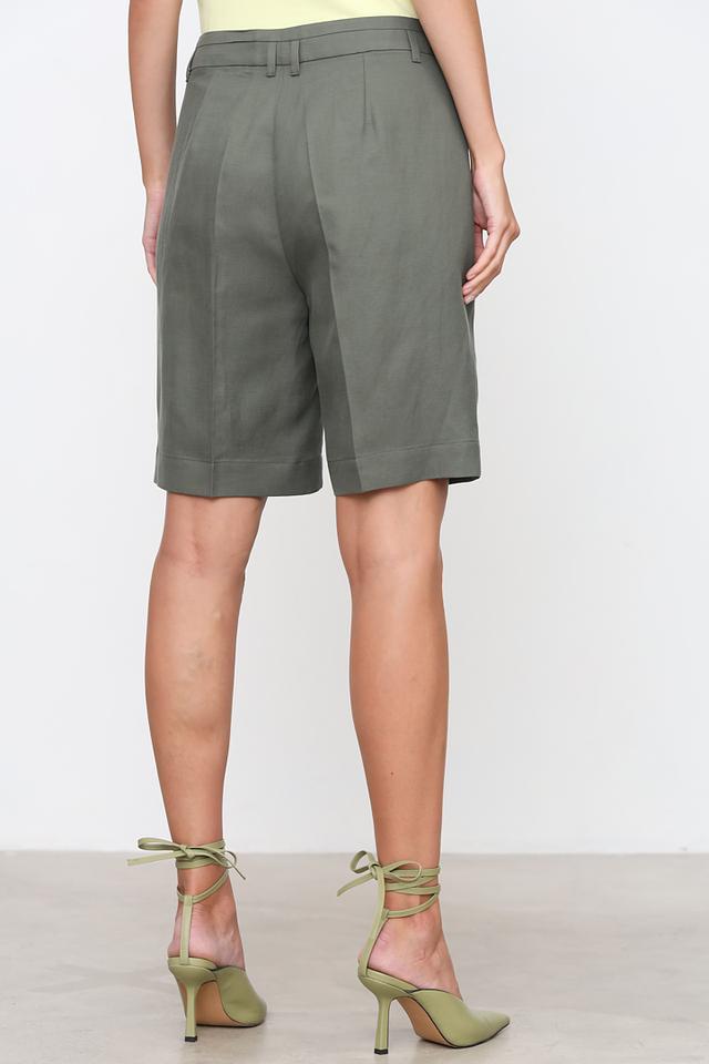 Шорты имеют прямой крой и классическую посадку по фигуре, обеспечивая комфорт в носке. Декоративные складки спереди придают модели элегантный вид. Застежка на молнию и пуговицу.