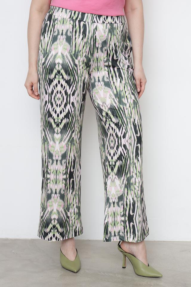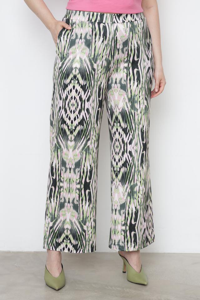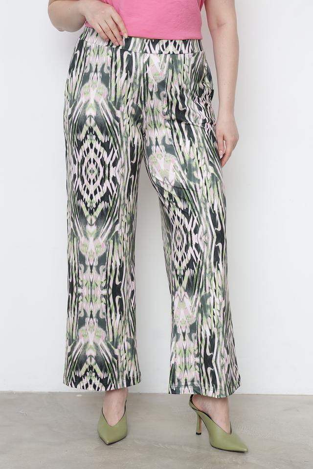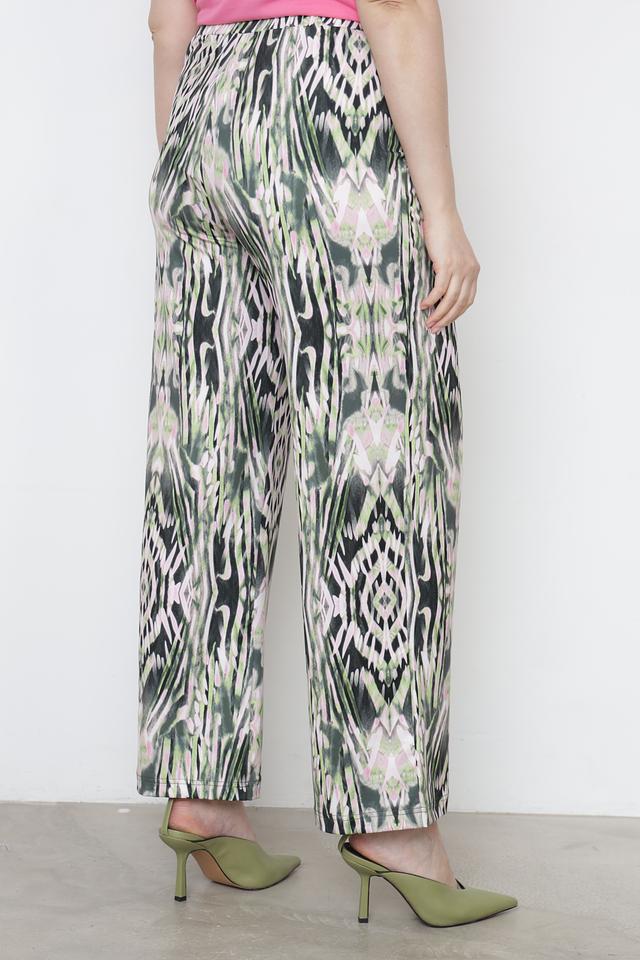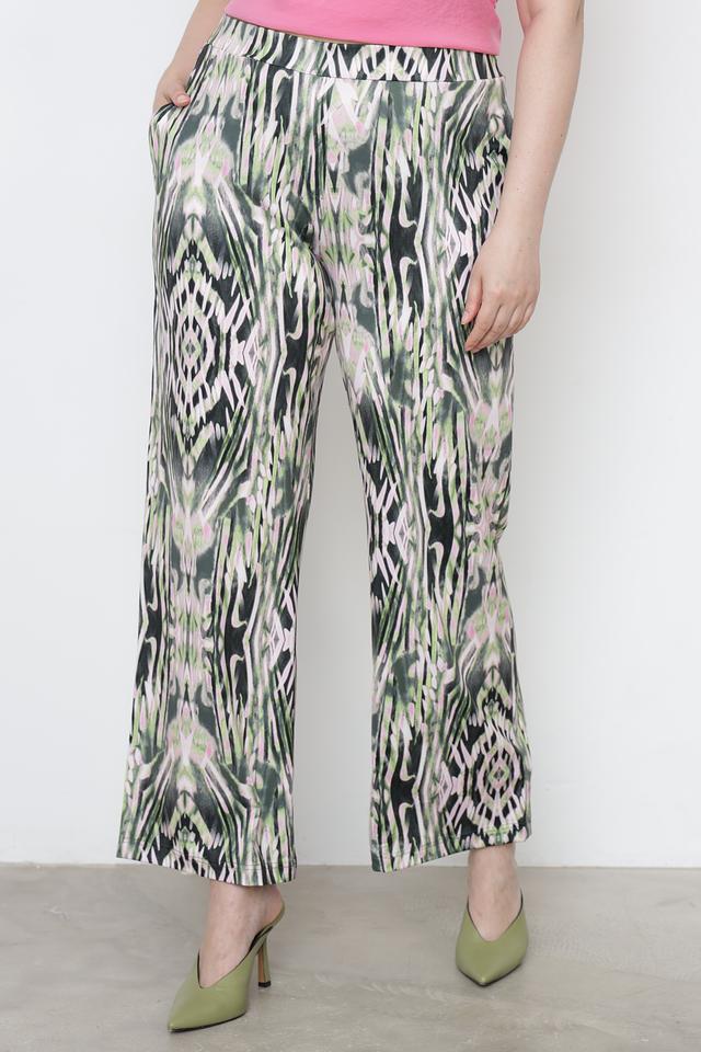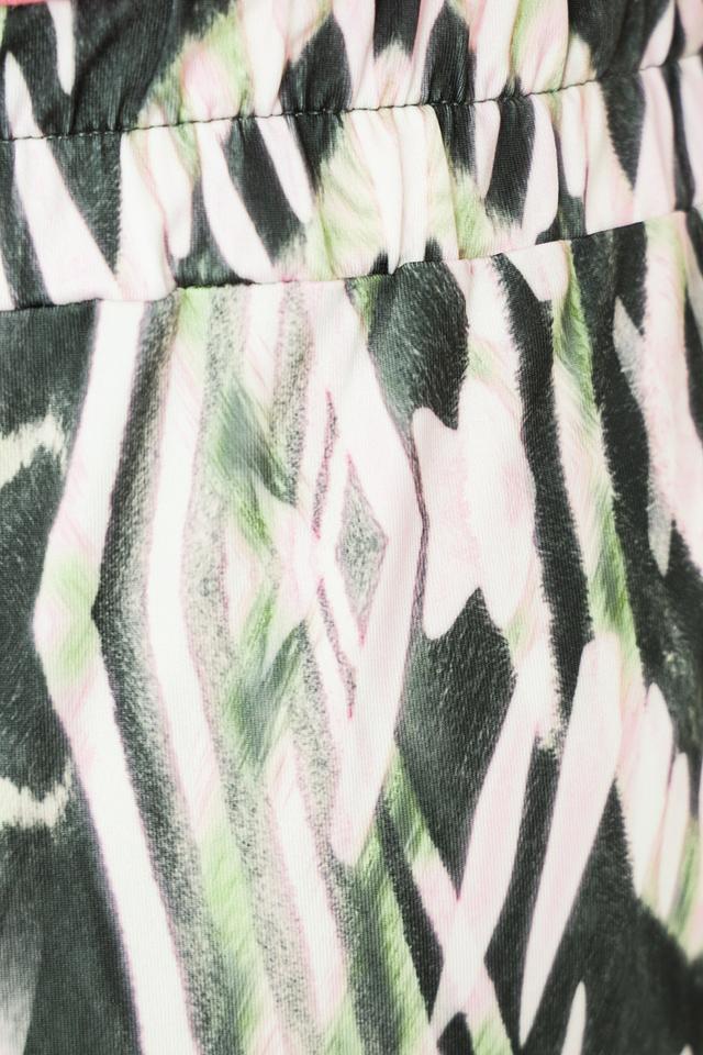 Брюки имеют прямой крой и зауженный книзу силуэт, что делает их универсальными для создания различных образов. Эластичный пояс обеспечивает комфортную посадку и свободу движений. Привлекательный геометрический принт в зеленых, розовых и черных тонах добавляет оригинальности.