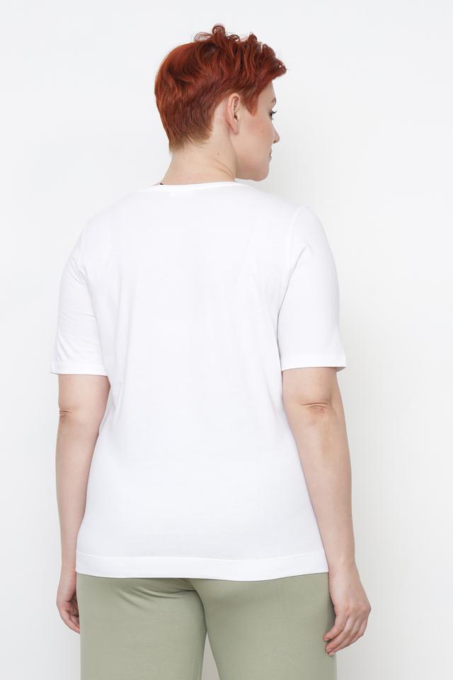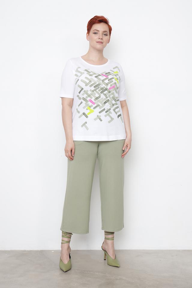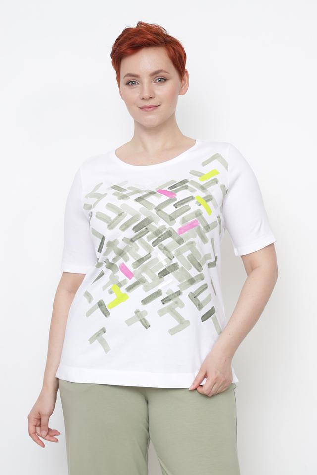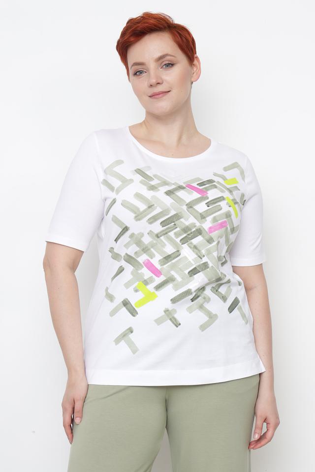Белая футболка Gerry Weber с оригинальным геометрическим принтом в зелёных и розовых тонах. Изготовлена из 100% органического хлопка, обеспечивающего комфорт и воздухопроницаемость. Состав: хлопок органич. 100%