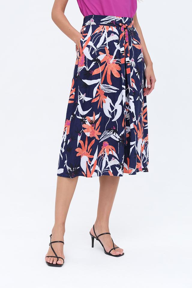 Юбка имеет приталенный силуэт и длину миди, подчеркивающую женственность. Яркий цветочный принт на синем фоне делает эту модель особенно привлекательной и запоминающейся. Завязки на талии позволяют регулировать посадку и создавать различные силуэты.