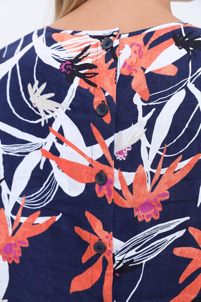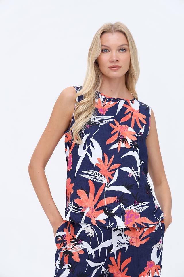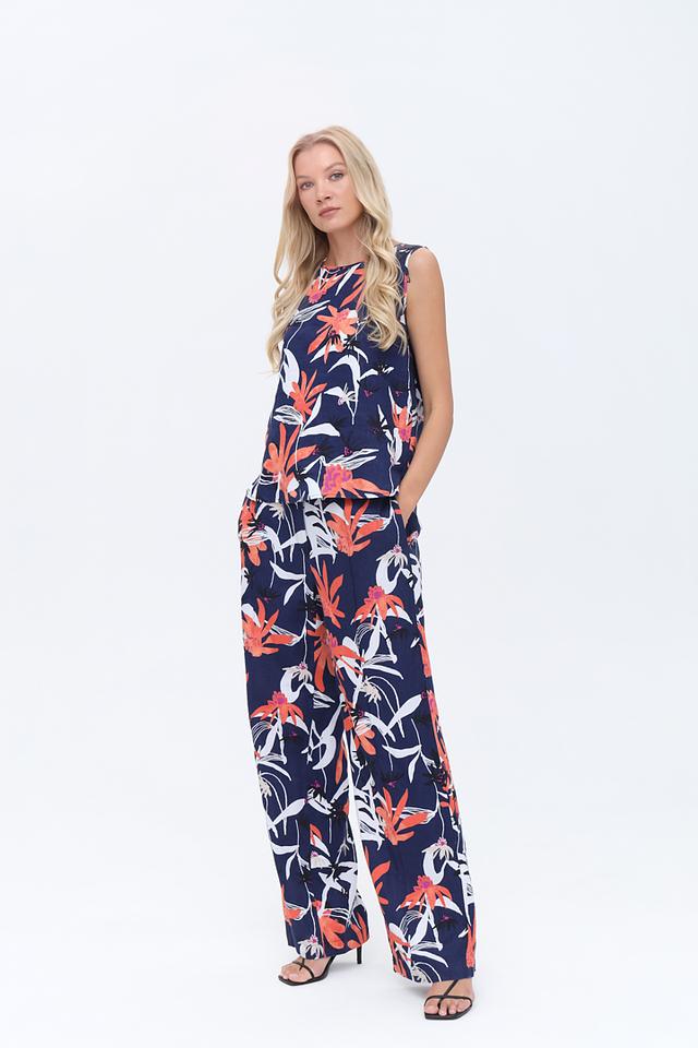 Дизайн топа представлен в виде яркого цветочного принта на синем фоне. Округлый вырез горловины и отсутствие рукавов придают модели лёгкость и непринуждённость. Топ идеально сочетается с брюками, юбками или шортами, создавая разнообразные образы для повседневной носки или особых случаев.