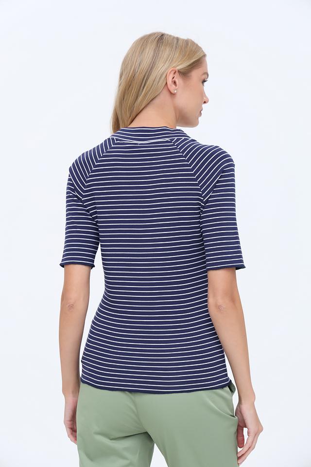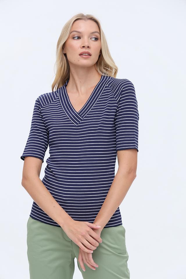 Женская футболка Gerry Weber синего цвета с белыми полосками и V-образным вырезом. Изготовлена из мягкого хлопка с добавлением эластана для комфортной посадки и свободы движений. Состав: хлопок 94%, эластан 6%