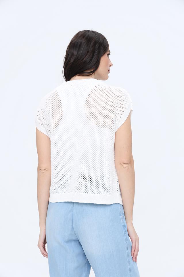 Этот стильный пуловер от Gerry Weber выполнен в белом цвете и отличается оригинальной ажурной вязкой. Короткие рукава делают его идеальным выбором для тёплой погоды.