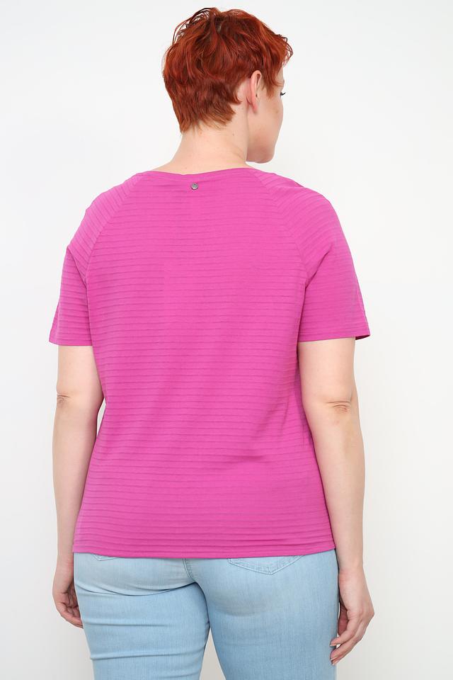 Футболка имеет яркий цвет фуксии и текстурированную поверхность, которая придает ей оригинальность. Короткие рукава и круглый вырез горловины делают ее универсальной для различных образов.