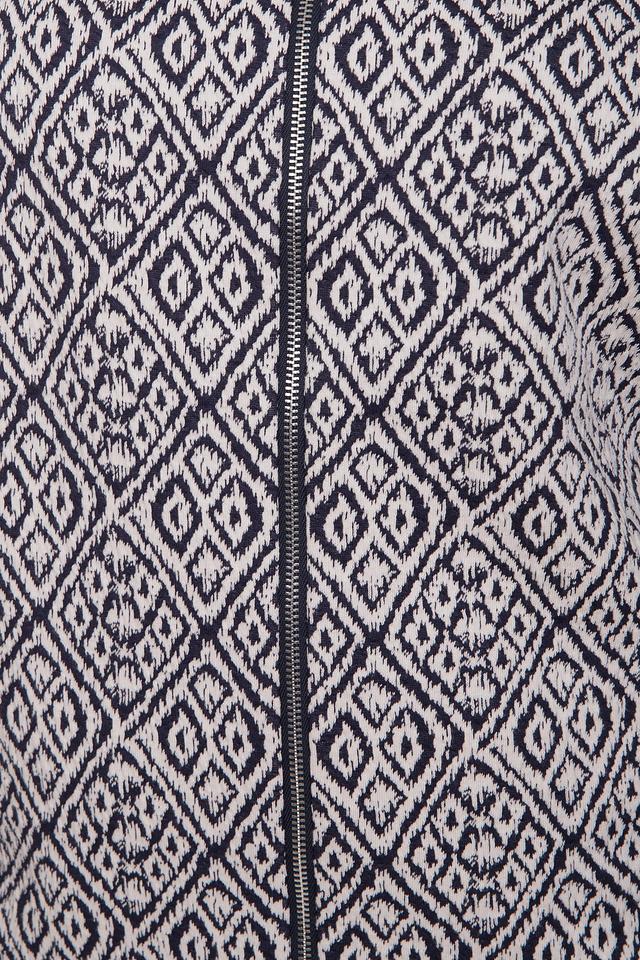 Жакет Gerry Weber белого цвета с геометрическим принтом – стильное и удобное решение для создания элегантного образа. Модель застегивается на молнию и имеет контрастные вставки тёмно-синего цвета. Состав: полиэстер 58%, хлопок 40%, эластан 2%