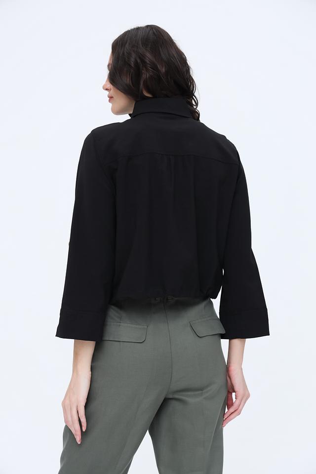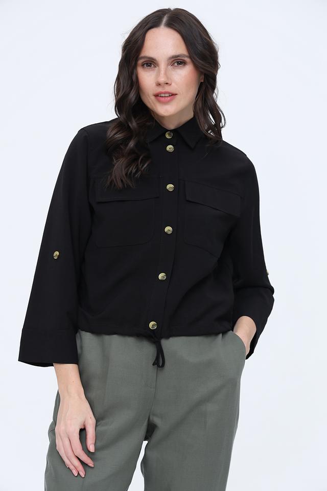 Жакет имеет прямую форму, воротник рубашечного типа и застёжку на пуговицы золотистого цвета. Накладные карманы добавляют практичности, а рукава три четверти делают его идеальным для тёплой погоды.