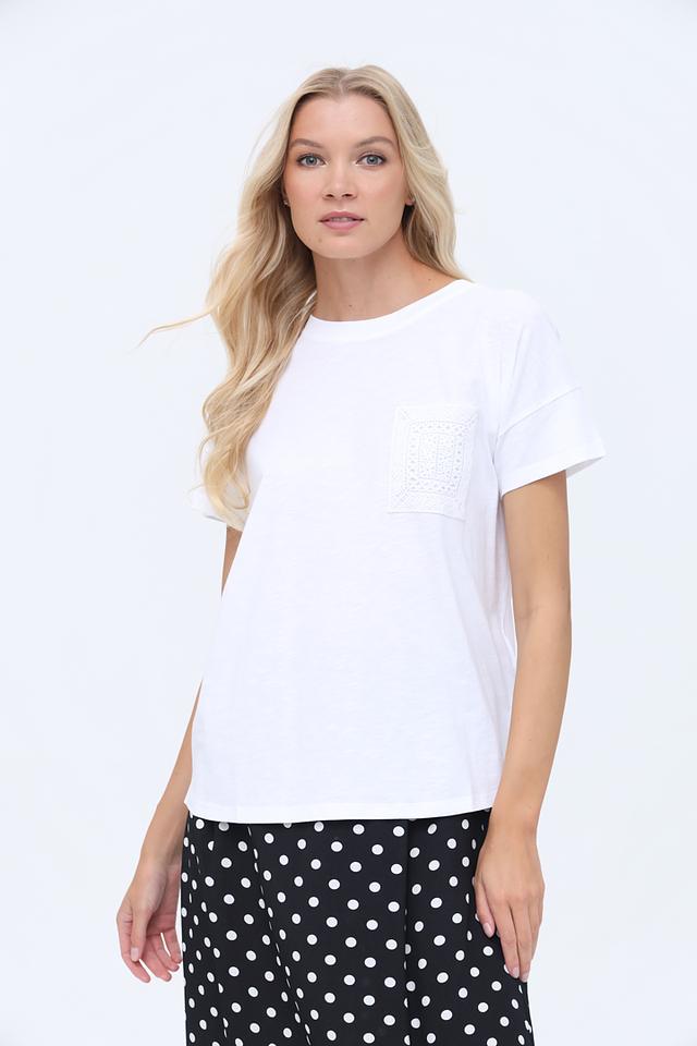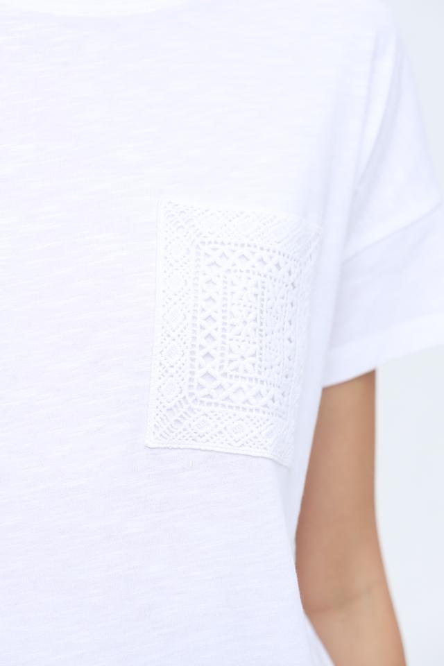 Особенностью данной модели является декоративный карман на груди, выполненный из изящного кружева, который придает футболке женственность и элегантность. Короткий рукав и свободный крой обеспечивают комфорт в жаркую погоду.