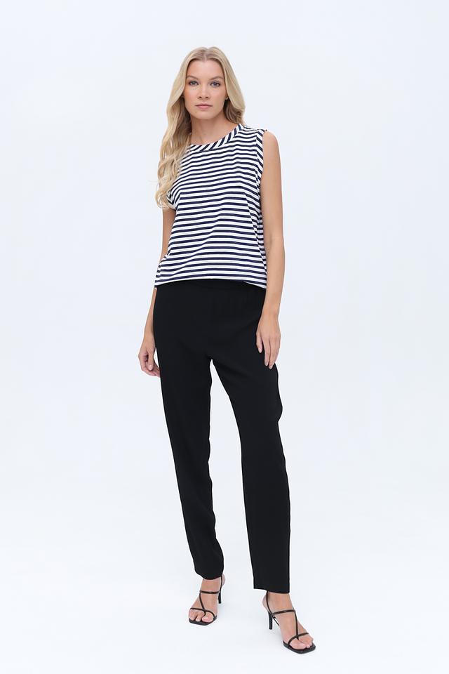 Топ имеет прямой крой и удобную посадку по фигуре. Округлый вырез горловины и отсутствие рукавов делают его идеальным выбором для теплой погоды. Изготовлен из высококачественного трикотажа, состоящего из хлопка, модала, полиэстера, полиамида и эластана, что обеспечивает комфорт и долговечность изделия.