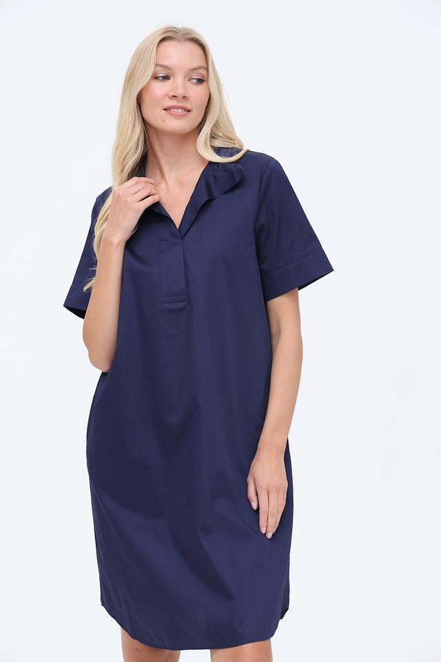 Синее платье от Gerry Weber EDITION – это стильное и комфортное решение для повседневного образа. Модель выполнена из 100% хлопка, имеет воротник-стойку и короткие рукава. Состав: хлопок 100%