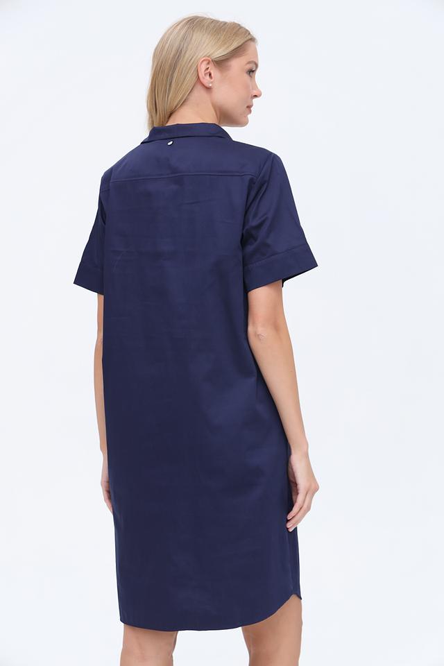 Особенностью модели является воротник-стойка и короткие рукава, придающие образу элегантность и лёгкость. Платье застегивается на пуговицы в верхней части, что позволяет регулировать степень открытия выреза. На груди расположен небольшой накладной карман.
