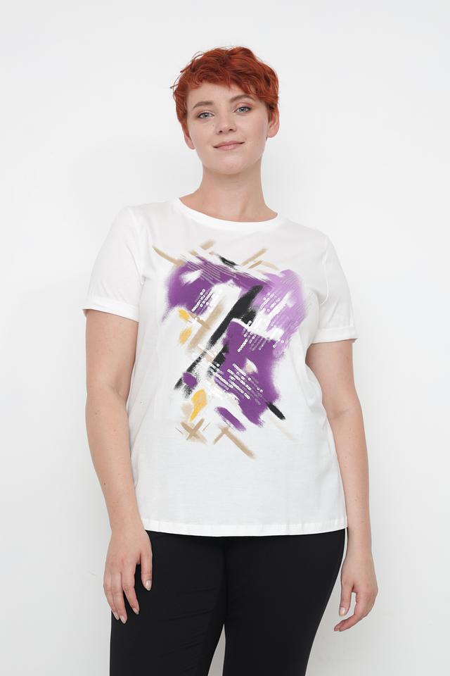 Белая футболка Gerry Weber EDITION с абстрактным принтом в фиолетовых и жёлтых тонах. Изготовлена из органического хлопка, обеспечивающего комфорт и воздухопроницаемость. Стильный и удобный вариант для повседневного образа. Состав: хлопок органич. 100%
