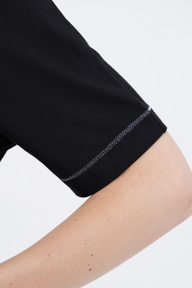 Особенностью данной модели является декоративная отделка в виде вертикальных полос, выполненных в технике вырезания и отделки контрастной нитью. Это придает футболке оригинальный и современный вид.