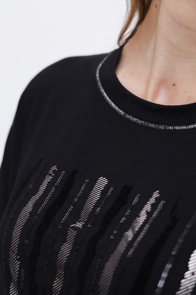 Чёрная футболка Gerry Weber с оригинальным декором в виде вертикальных полос. Изготовлена из мягкого модала с добавлением эластана для комфорта и хорошей посадки. Стильный и удобный выбор для повседневного образа. Состав: модал 95%, эластан 5%