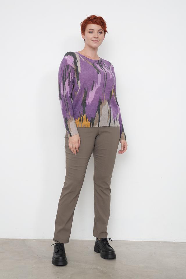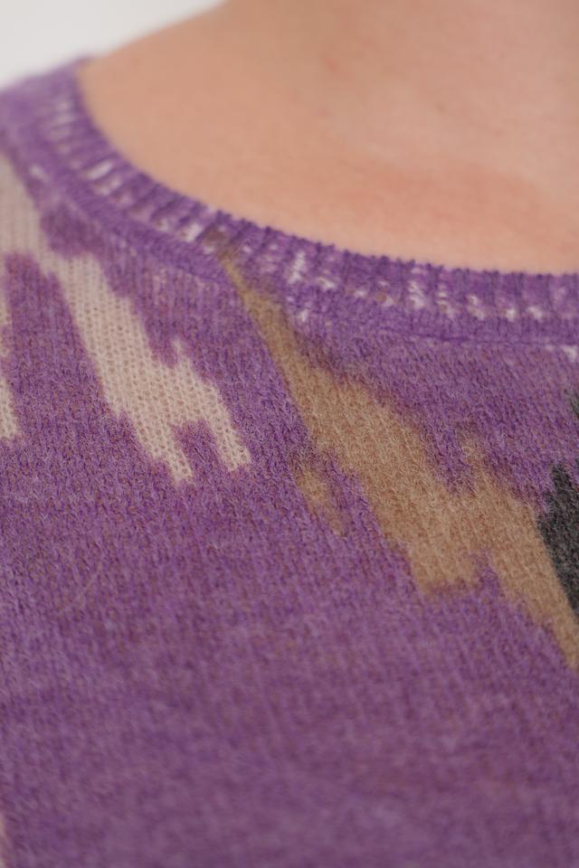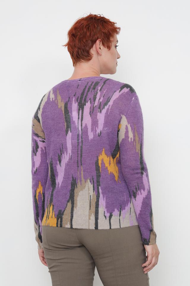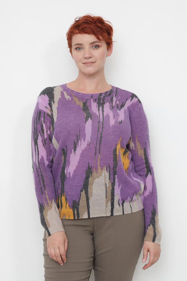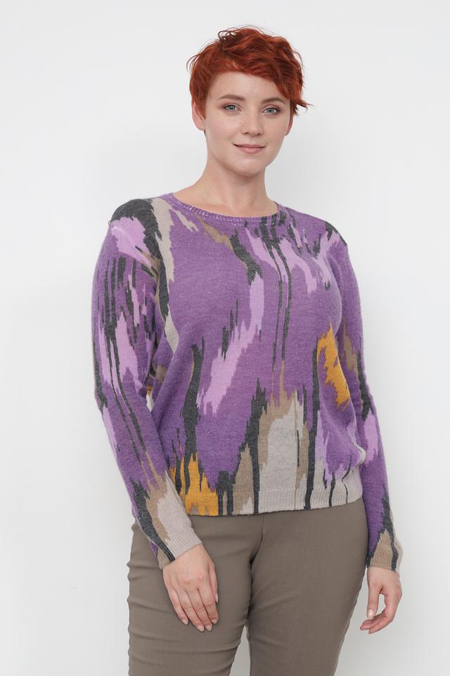 Пуловер имеет свободный крой, который обеспечивает комфортную посадку по фигуре. Его отличает яркий и необычный абстрактный узор, выполненный в фиолетовых, серых и горчичных тонах. Круглый вырез горловины и длинные рукава делают его универсальным для различных образов.