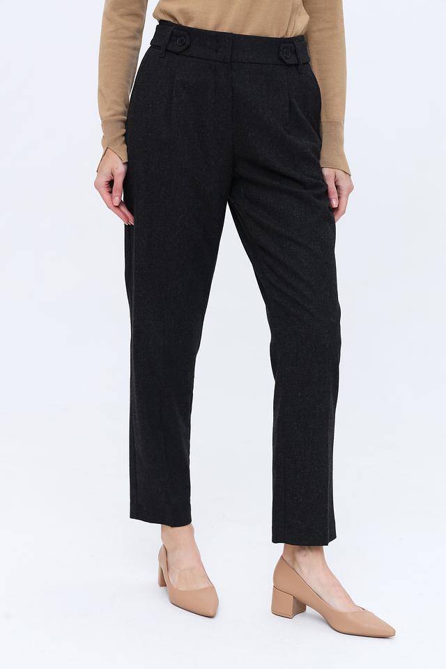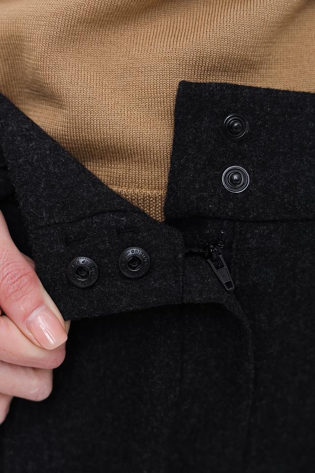 Брюки имеют прямой крой и высокую посадку, что обеспечивает комфортную посадку по фигуре и визуально удлиняет ноги. Декоративные складки на талии добавляют изысканности и подчеркивают талию. Застежка на молнию и пуговицы обеспечивает надежную фиксацию.