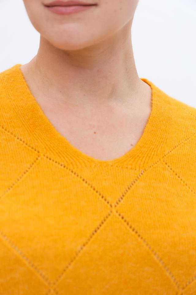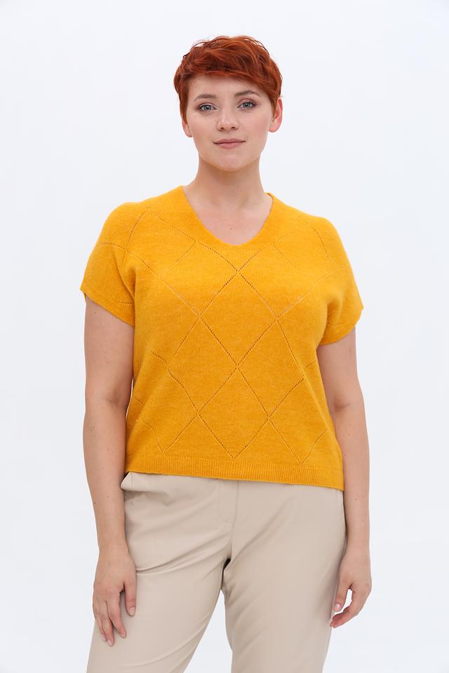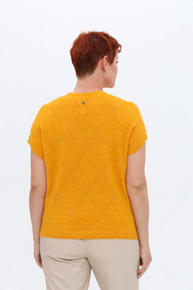 Женский пуловер Gerry Weber горчичного цвета с узором ромбами станет стильным дополнением к вашему гардеробу. Модель с V-образным вырезом и короткими рукавами идеально подходит для создания модных образов. Состав: полиамид 43%, полиакрил 39%, шерсть овечья 10%, шерсть альпаки 5%, эластан 3%