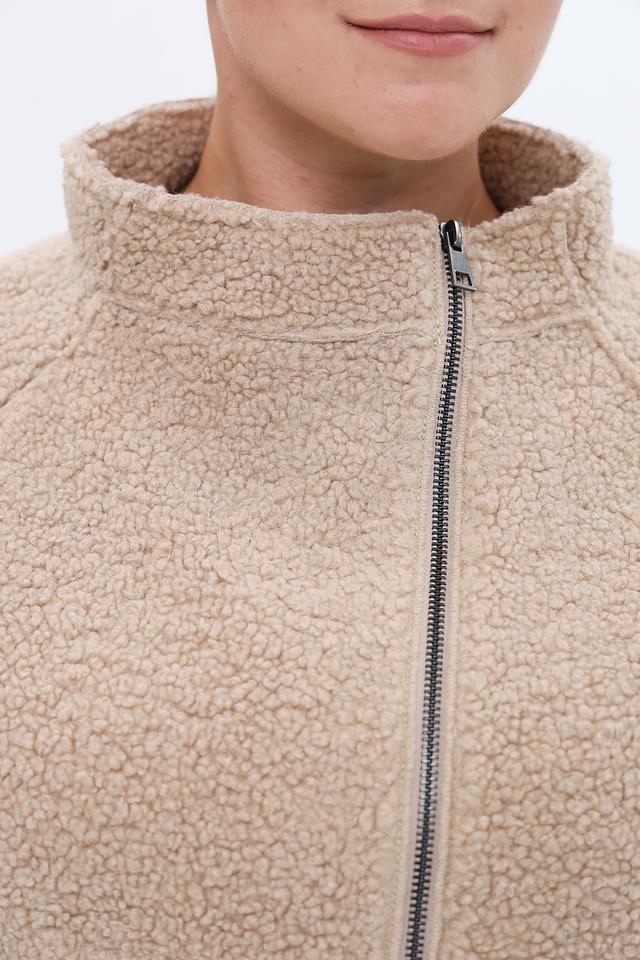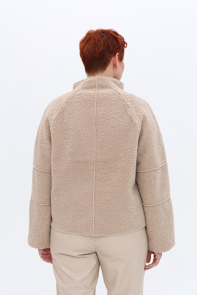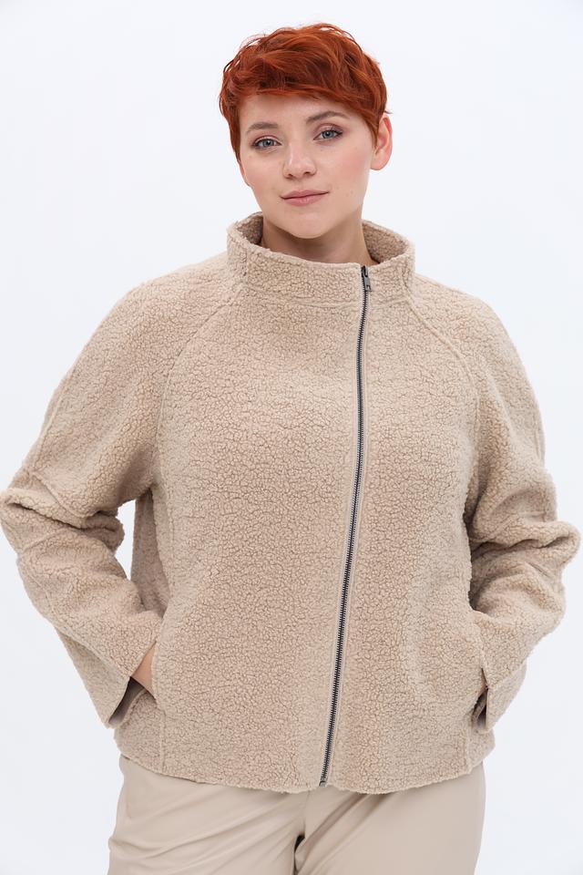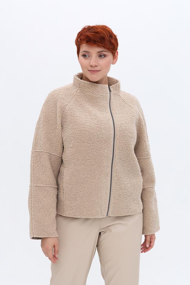 Куртка застегивается на молнию, которая проходит по всей длине изделия. Воротник-стойка добавляет куртке аккуратный вид. Текстура ткани напоминает мягкий плюш или овечью шерсть, что придает куртке особый шарм и тепло.