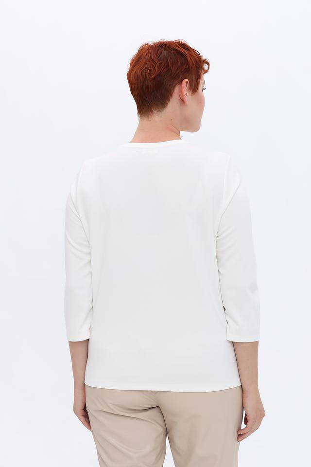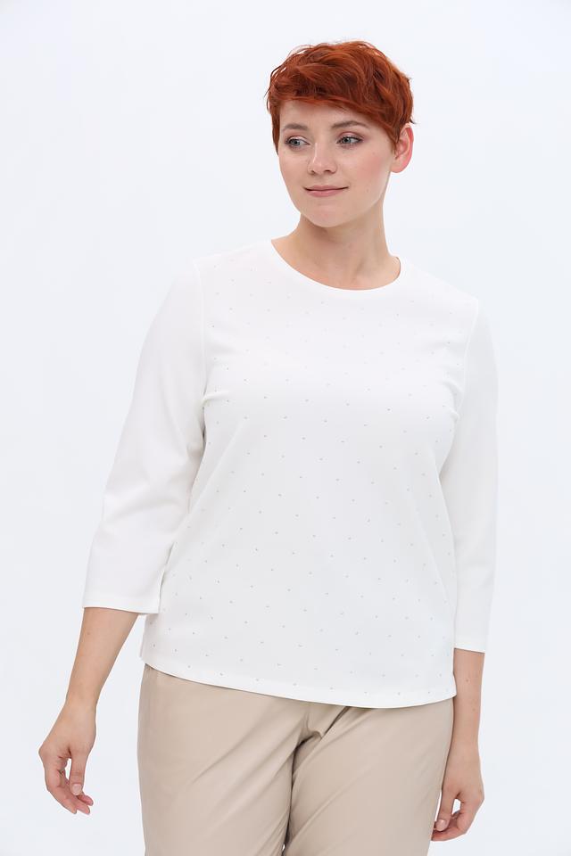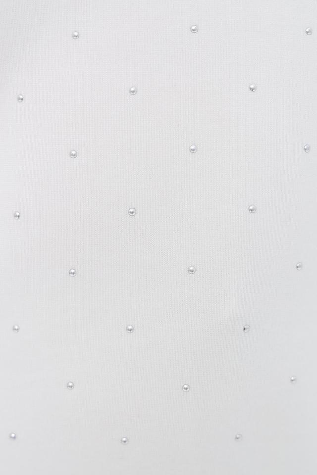 Модель имеет прямой крой, круглый вырез горловины и рукава длиной три четверти. Пуловер украшен деликатной вышивкой из мелких камней, которые придают ему особый шарм и блеск.