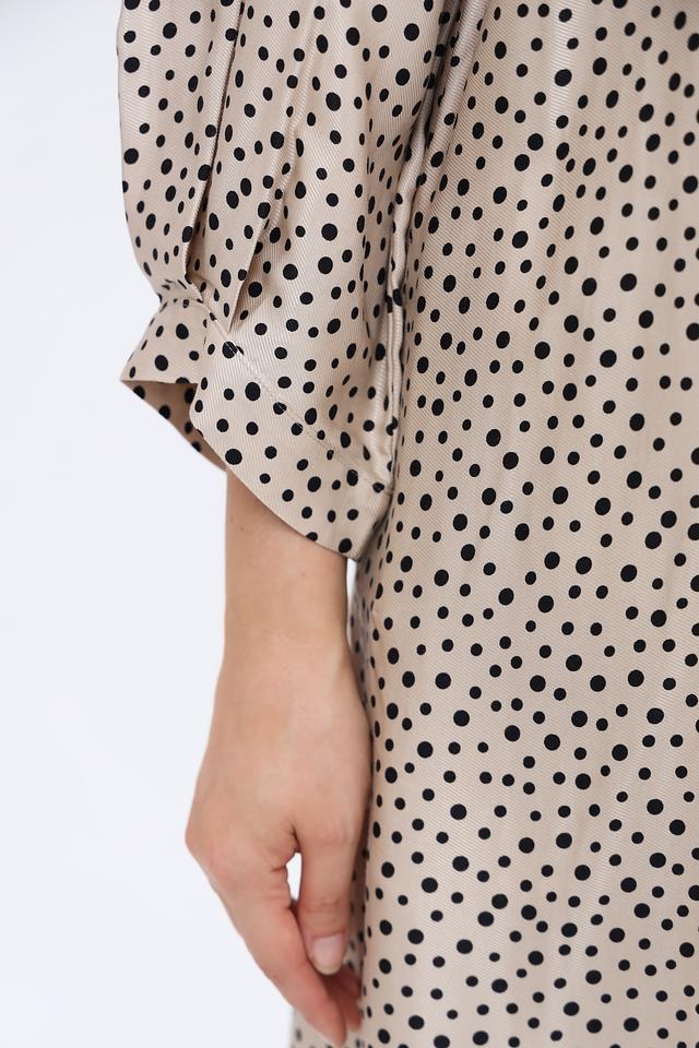 Основной цвет платья – бежевый, украшен мелким принтом в тёмно-коричневый горошек. Нижняя часть платья оформлена горизонтальными полосами в сочетании темно-синего, бежевого и белого цветов, что добавляет модели оригинальности.