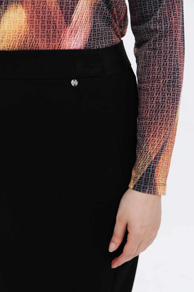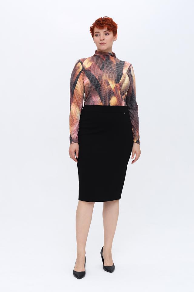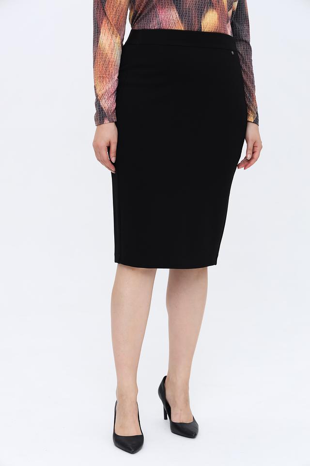 Чёрный цвет юбки позволяет легко сочетать её с различными элементами одежды и аксессуарами. Прямой силуэт и длина до колена подчеркивают достоинства фигуры и создают элегантный образ. Эластичный пояс обеспечивает удобную посадку и не сковывает движений.