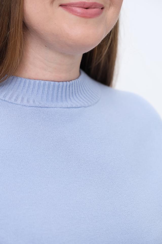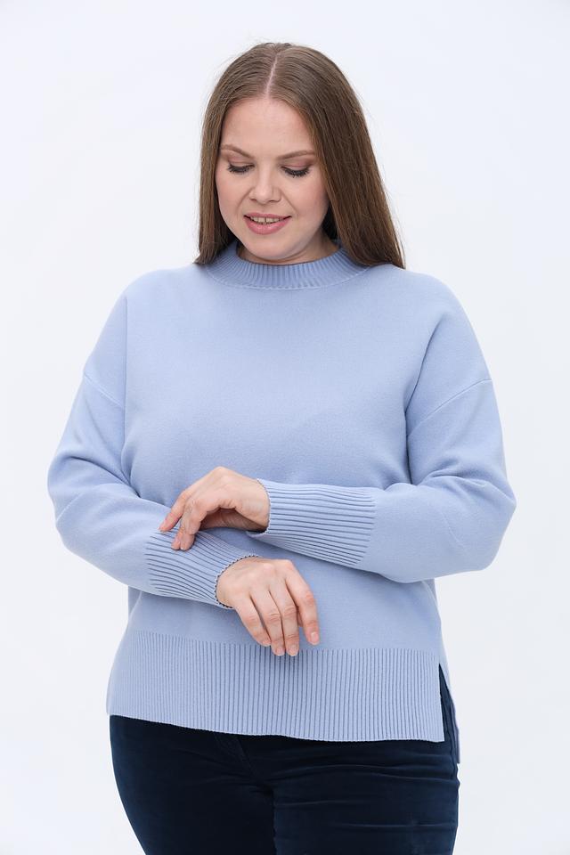 Пуловер имеет прямой крой, круглый вырез горловины и длинные рукава с вязаными манжетами. Низ изделия также оформлен вязаной резинкой. Текстура вязки придает изделию аккуратный и стильный вид.