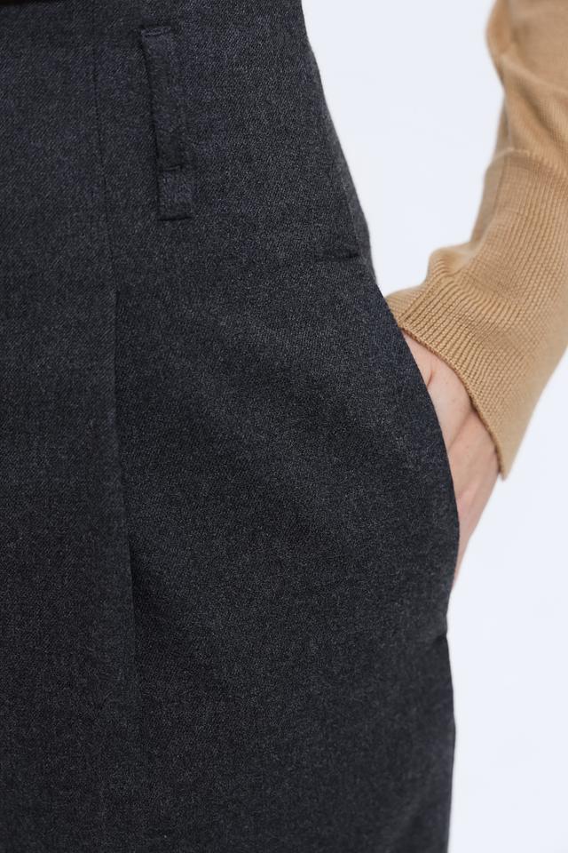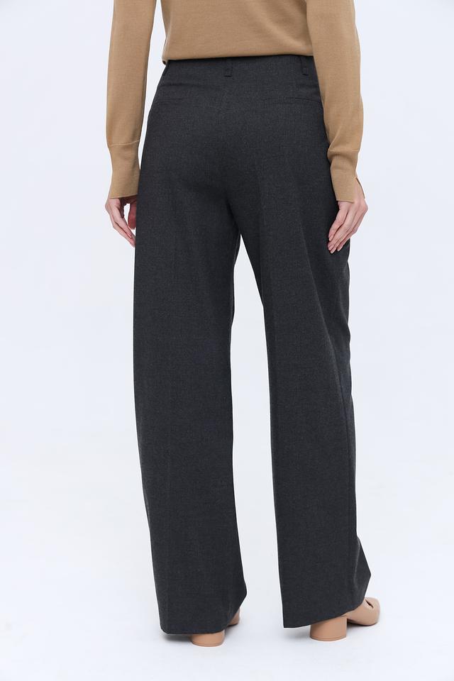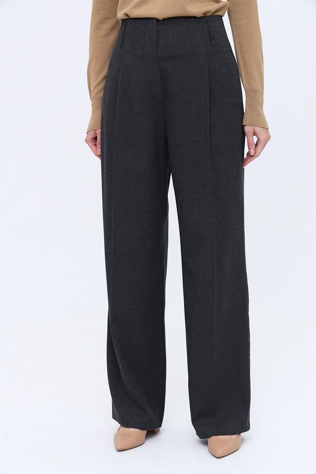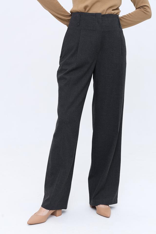 Брюки имеют прямой крой и широкие штанины, что придает им современный и стильный вид. Завышенная талия подчеркивает фигуру и обеспечивает комфортную посадку.