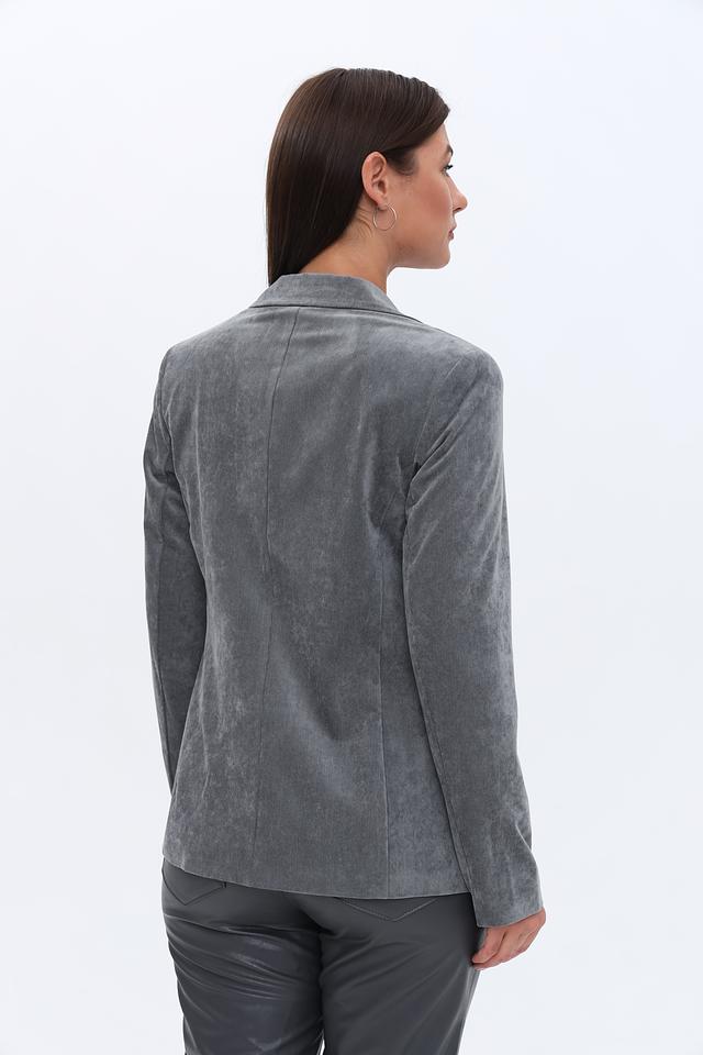 Модель выполнена из высококачественного материала, сочетающего в себе полиэстер, полиамид и эластан, что обеспечивает комфорт в носке и отличную посадку по фигуре. Текстура ткани напоминает замшу, придавая жакету особый шарм.