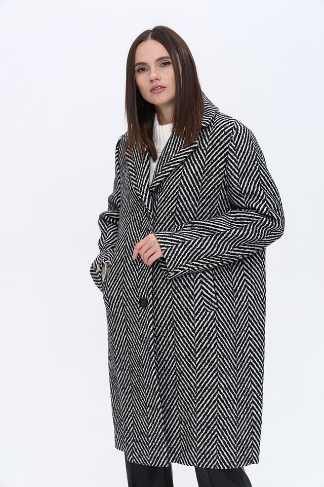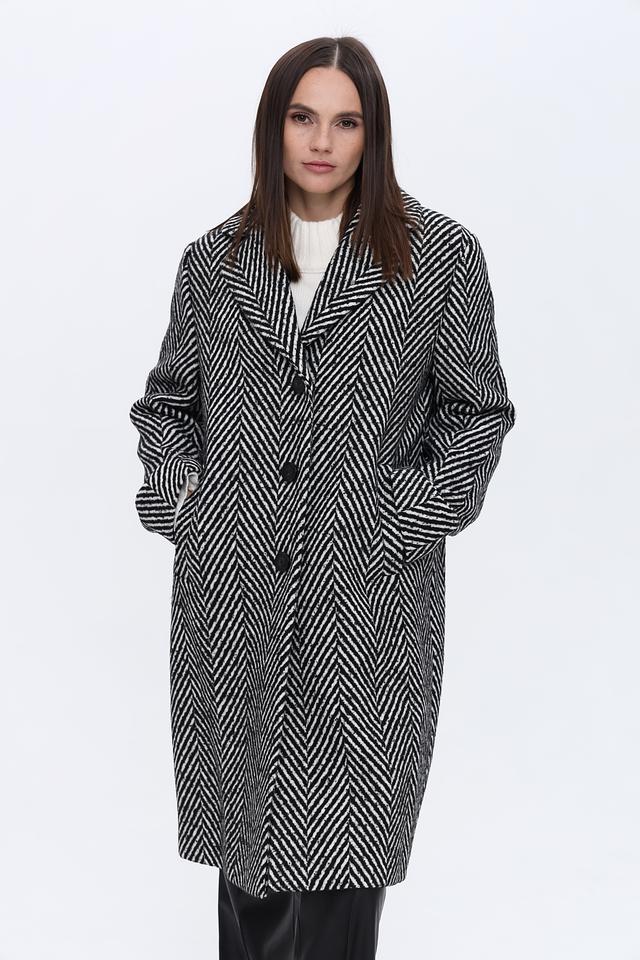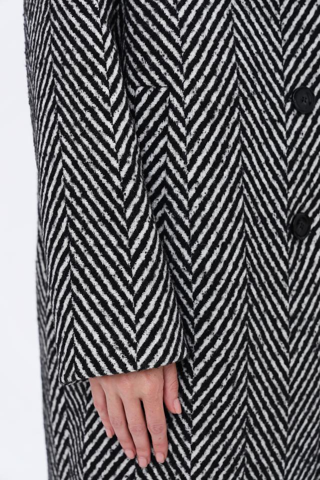 Чёрно-белый рисунок в ёлочку добавляет пальто оригинальности и стиля. Длина миди делает его универсальным для различных образов. Пальто идеально подойдёт для создания как повседневных, так и более формальных луков.