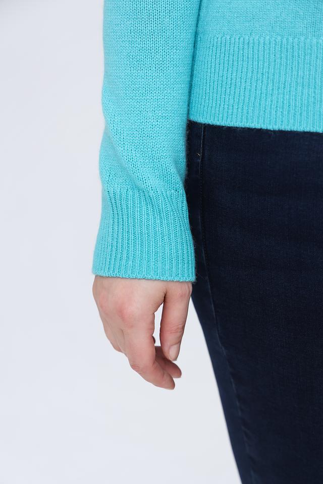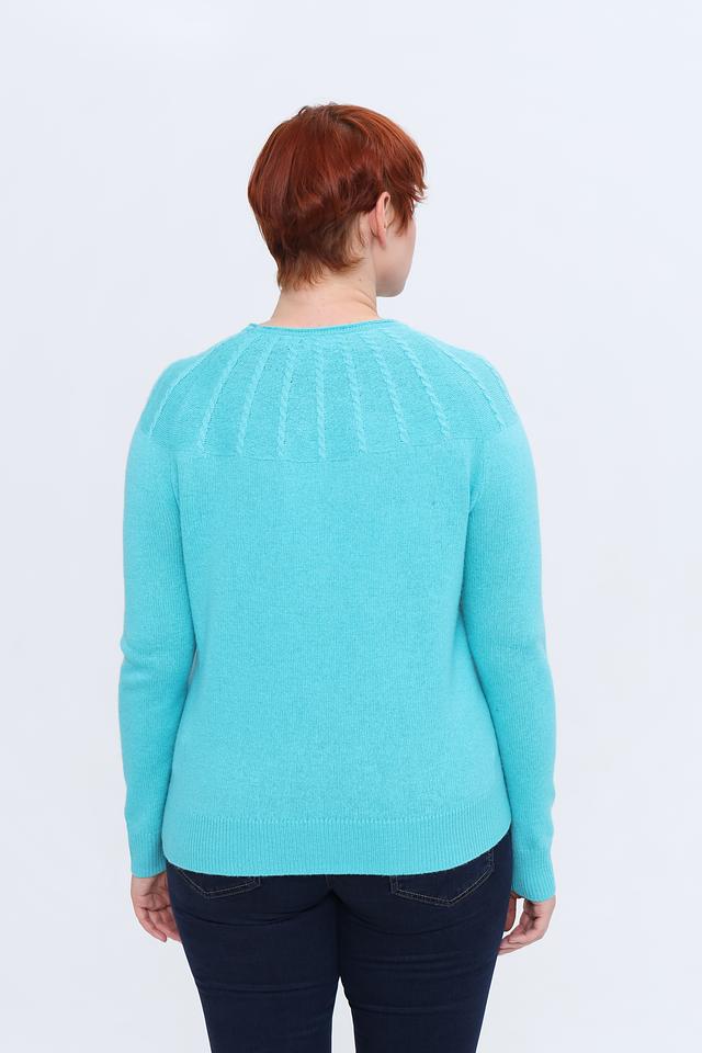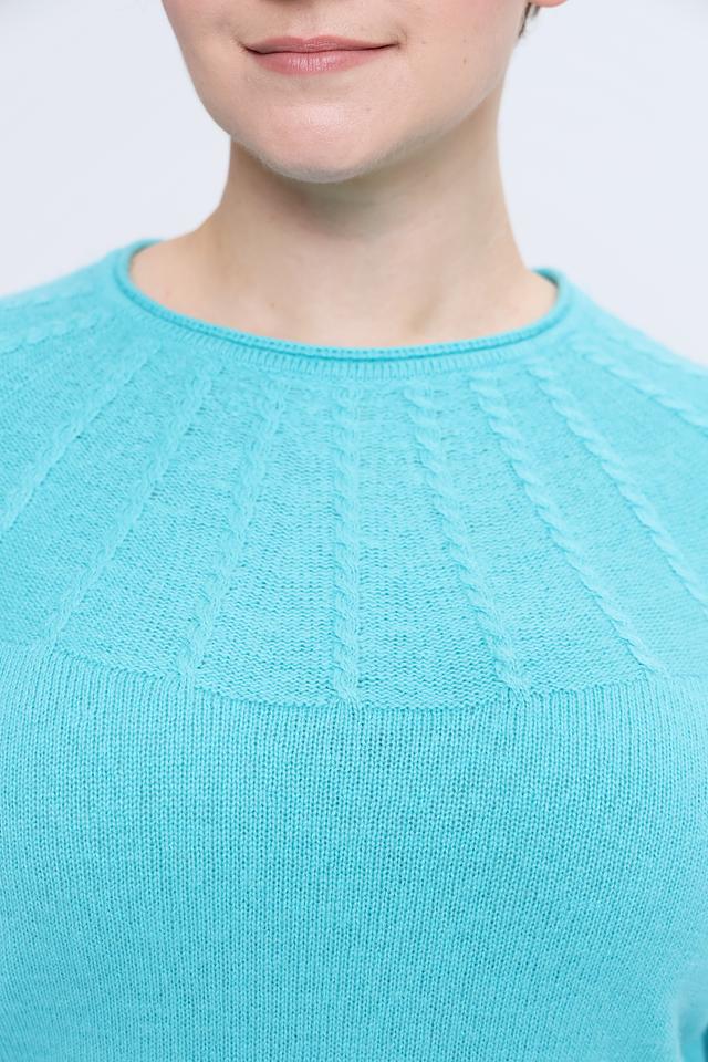 Пуловер имеет классический крой с длинными рукавами и круглым вырезом горловины. Особенностью модели является декоративная вязка на плечах, придающая ей изысканный вид. Цвет пуловера – нежный бирюзовый, который освежает образ и подходит к различным цветовым решениям.