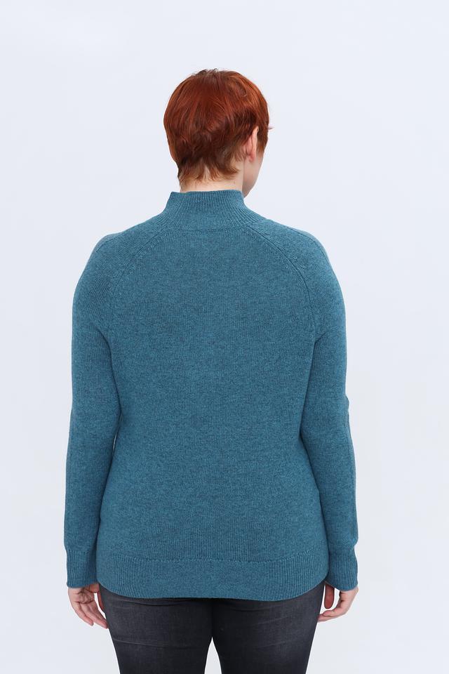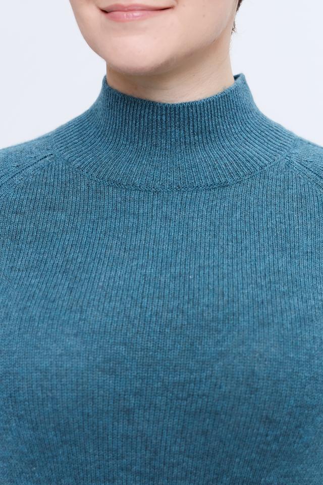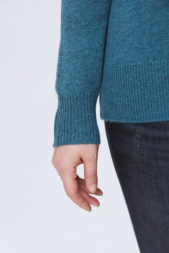 Пуловер имеет классический крой с высоким горлом, который обеспечивает дополнительное тепло и защиту в холодную погоду. Бирюзовый цвет придает изделию свежесть и оригинальность, позволяя легко сочетать его с различными элементами гардероба.