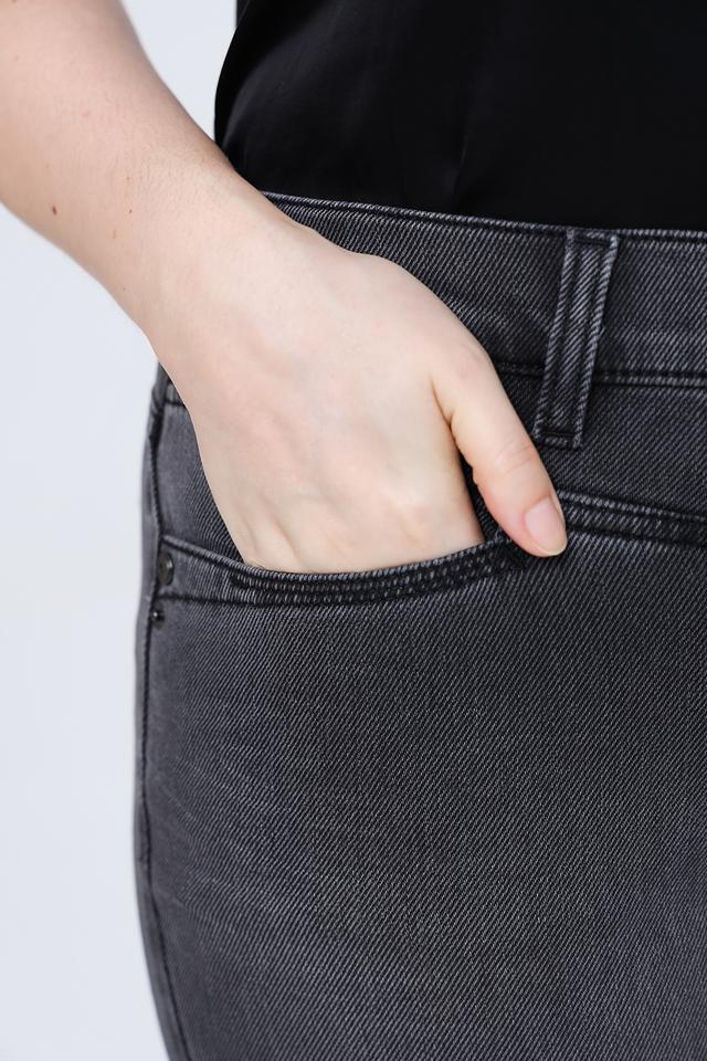 Джинсы имеют классический крой с зауженными к низу штанинами, что визуально удлиняет ноги и создает элегантный силуэт. Высокая посадка обеспечивает комфортную посадку по фигуре и подчеркивает талию. Ткань состоит из 77% хлопка, 10% вискозы, 10% переработанного полиэстера и 3% эластана, что обеспечивает мягкость, воздухопроницаемость и небольшую эластичность.