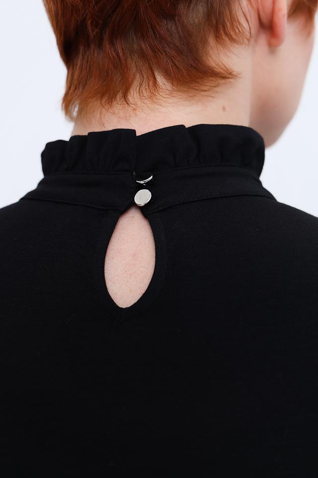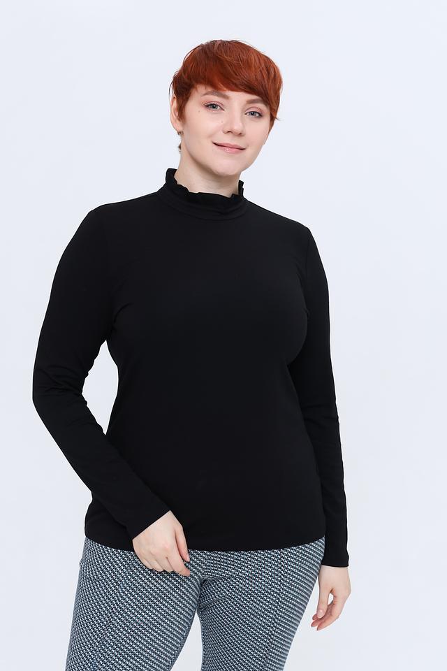 Лонгслив имеет облегающий силуэт, который подчеркивает фигуру, и воротник-стойку, украшенный нежной рюшью. Такой деликатный декор придает модели женственности и элегантности.
