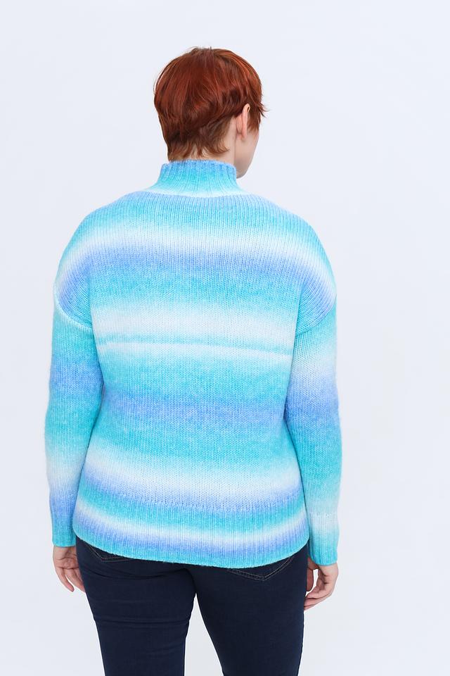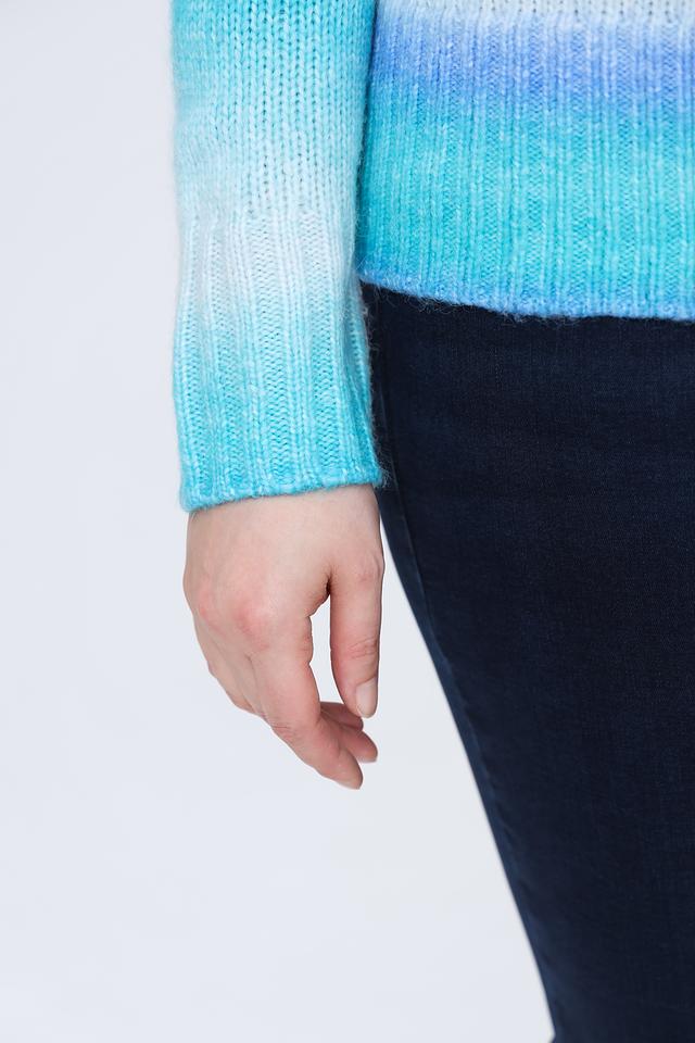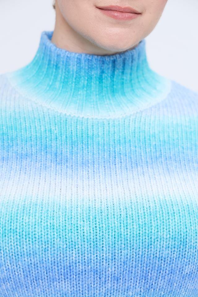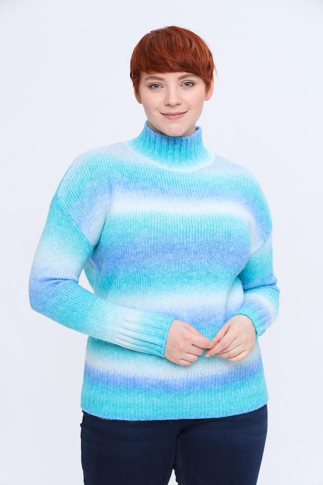 Пуловер имеет свободный крой, который обеспечивает комфортную посадку по фигуре. Высокий воротник добавляет изысканности образу, а градиентный узор в голубых оттенках делает его особенно привлекательным.