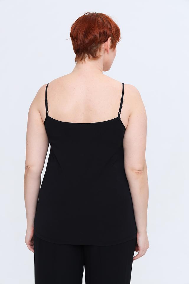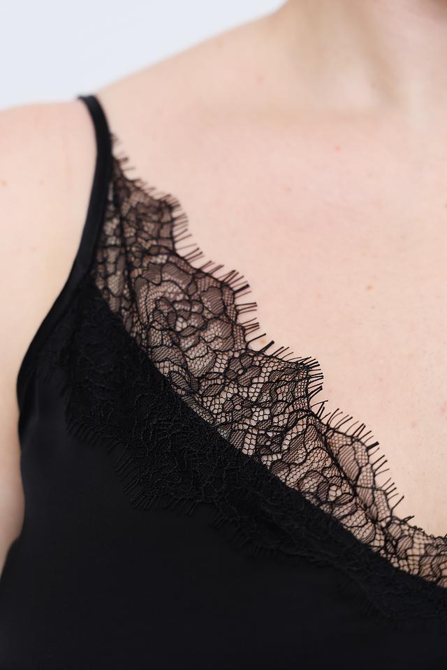 Тонкие бретели и прямой крой обеспечивают комфортную посадку по фигуре. Особый шарм топу придает деликатное кружево, обрамляющее вырез горловины, добавляя образу женственности и романтичности.