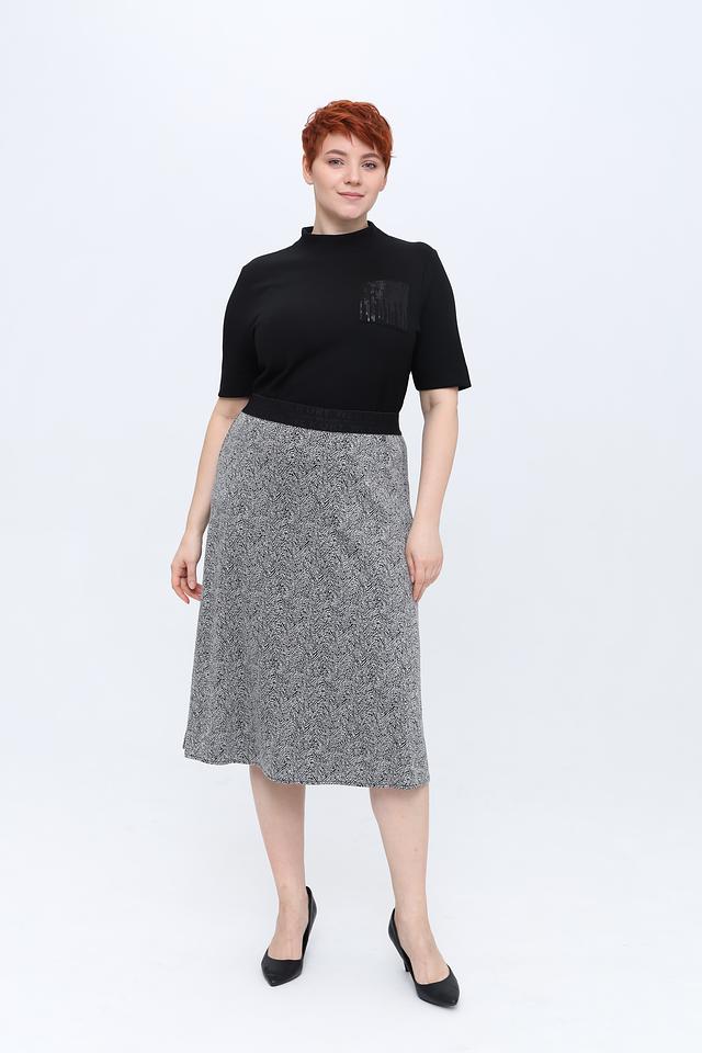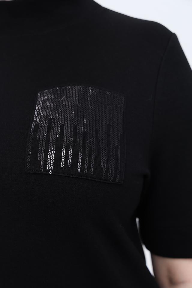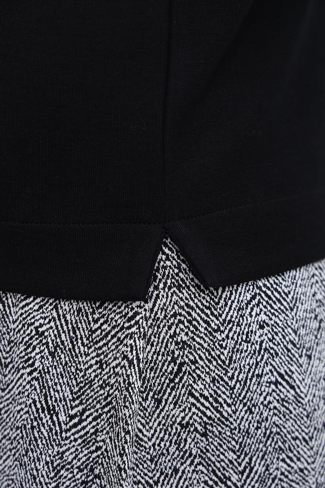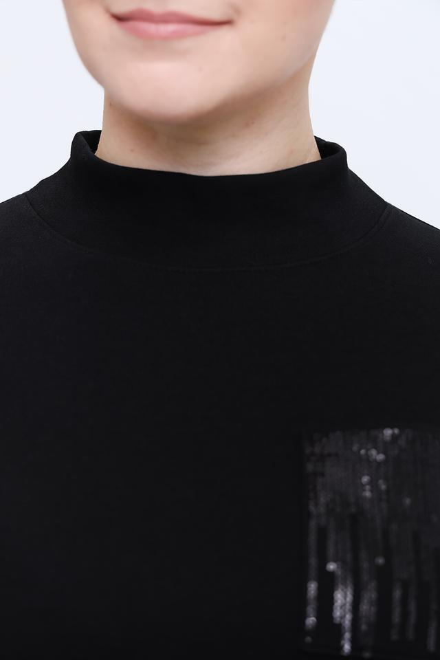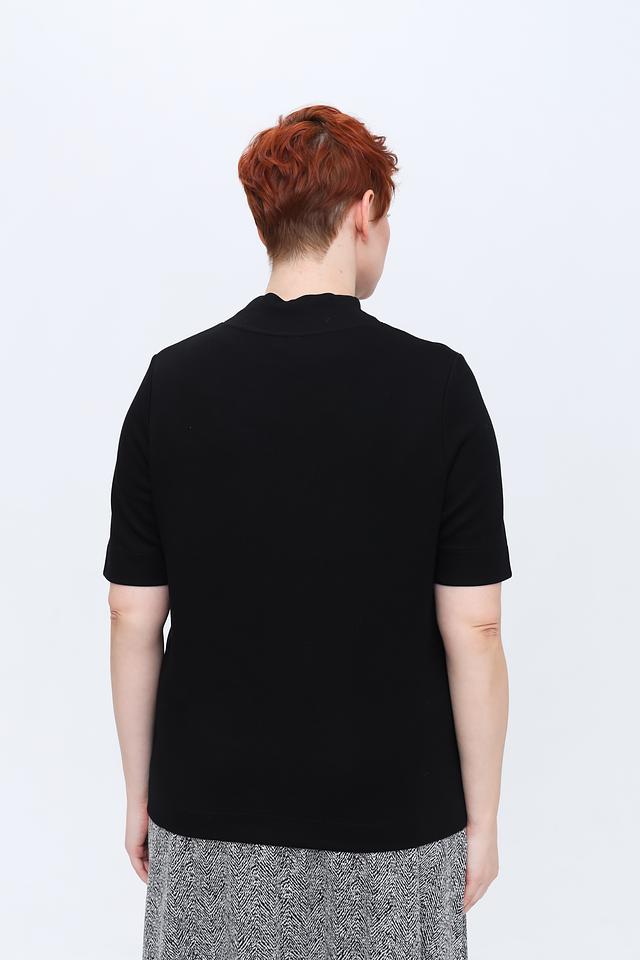 Модель имеет короткий рукав и удобный вырез горловины-стойка. Особый акцент в дизайне пуловера – декоративная вставка на груди, выполненная в виде абстрактного рисунка с использованием текстурных элементов.