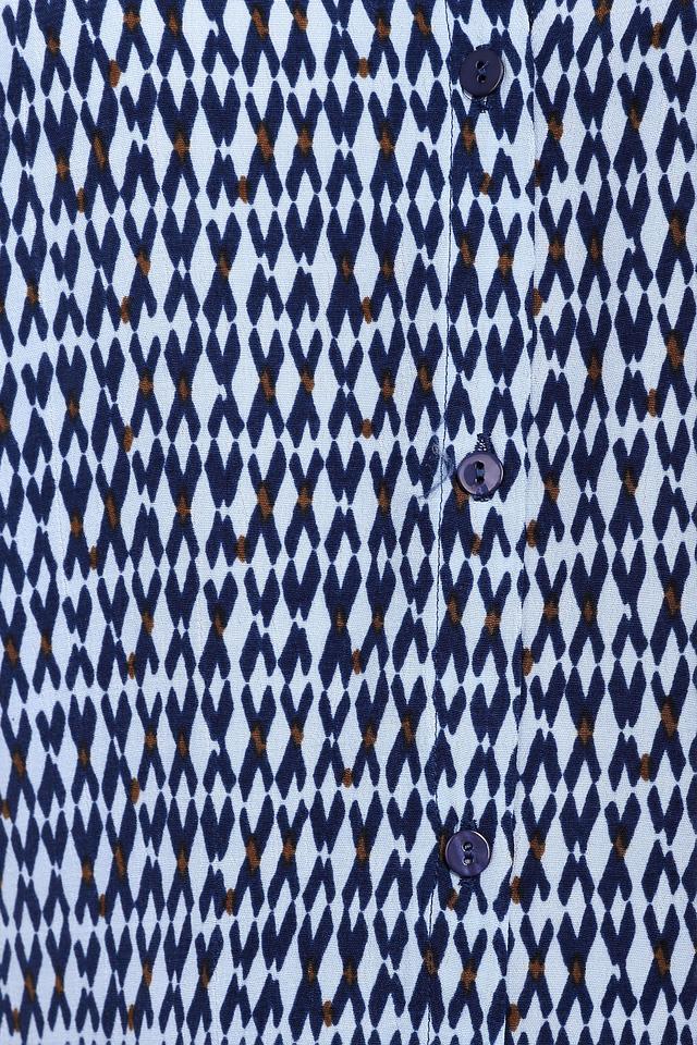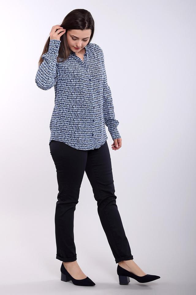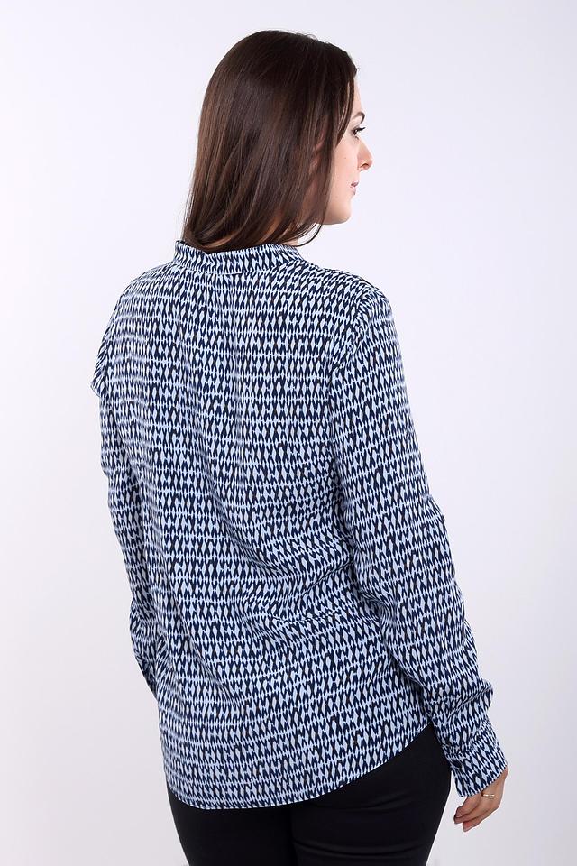 Блуза имеет классический крой с длинными рукавами и V-образным вырезом. Застёжка выполнена на пуговицы в тон ткани. Привлекает внимание оригинальный синий принт, состоящий из геометрических фигур.