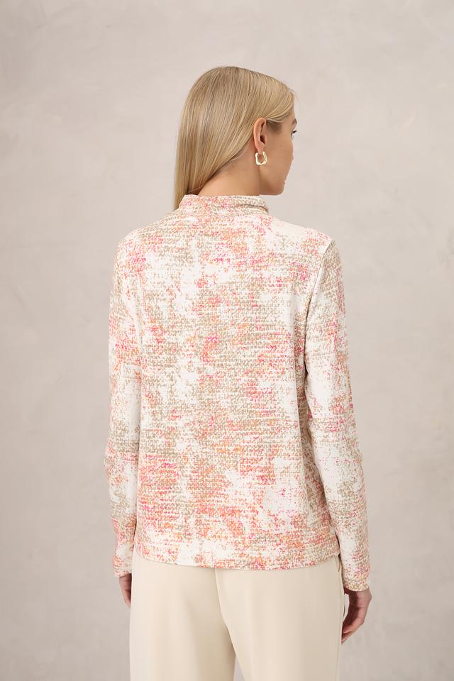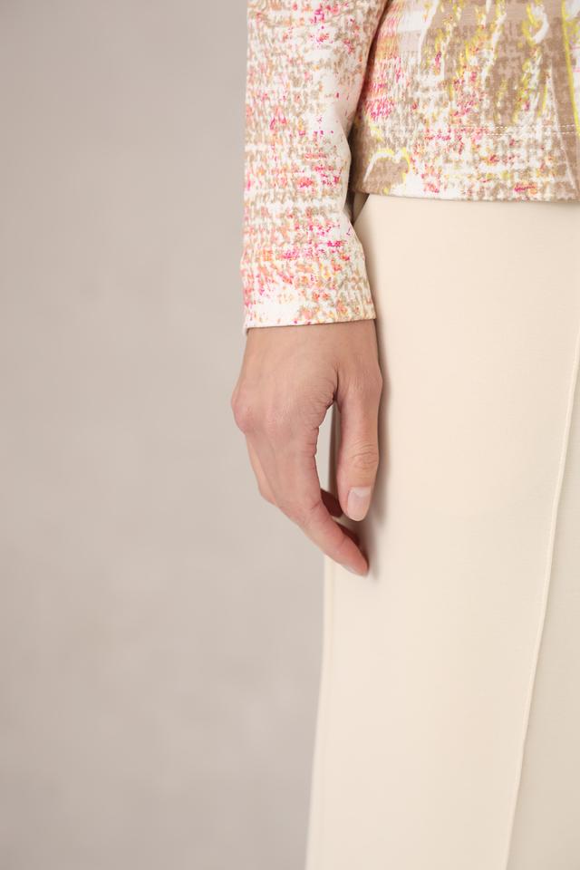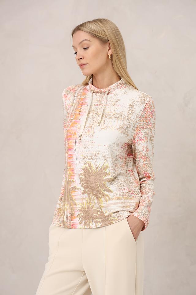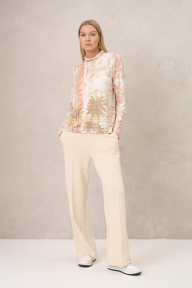 Блуза имеет длинные рукава и воротник-стойку, дополненный тонкими шнурками, которые придают ей оригинальный вид. Привлекает внимание яркий принт с изображением пальм и тропических мотивов, выполненный в нежных оттенках бежевого, розового и золотистого.
