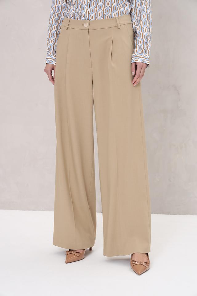Брюки имеют классический крой с завышенной талией и широкими штанинами, что визуально удлиняет силуэт и создает женственный образ. Передняя часть брюк дополнена аккуратными складками, придающими им более изысканный вид. Застежка на молнию и пуговицу обеспечивает надежную фиксацию.