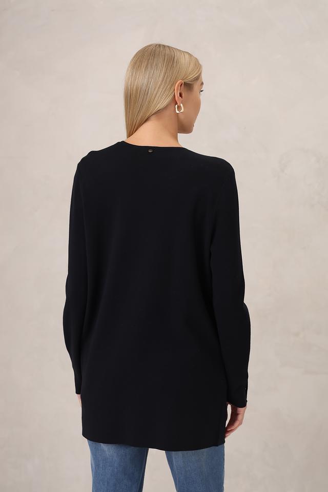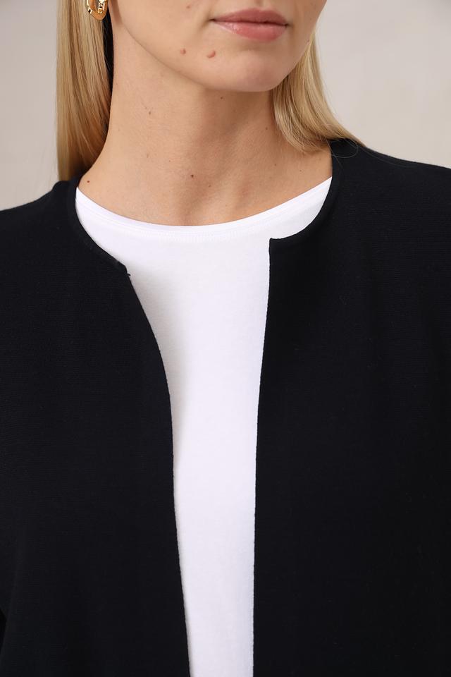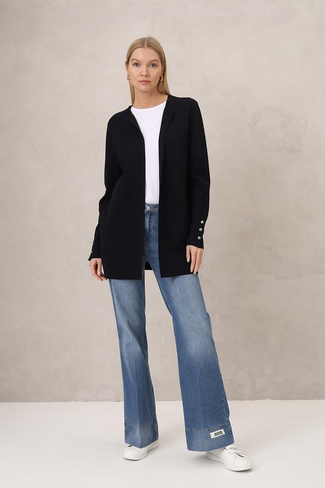 Жакет имеет прямой крой, который обеспечивает свободу движений и комфортную посадку по фигуре. Длинные рукава и отсутствие застежки создают расслабленный и непринужденный образ.